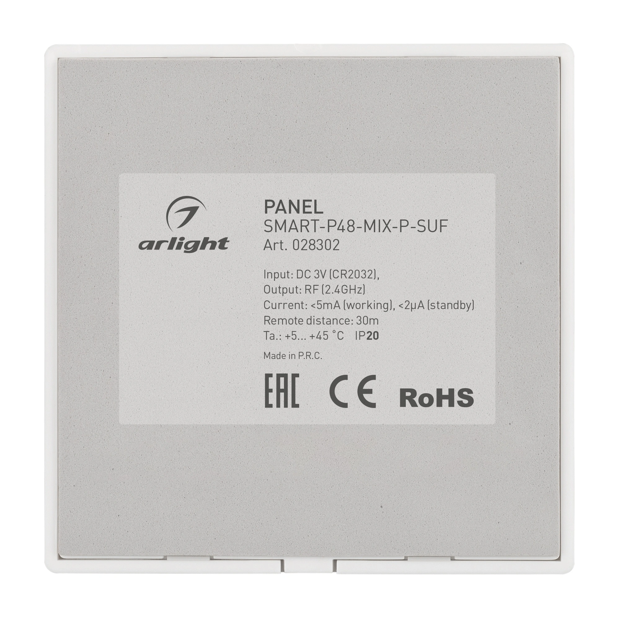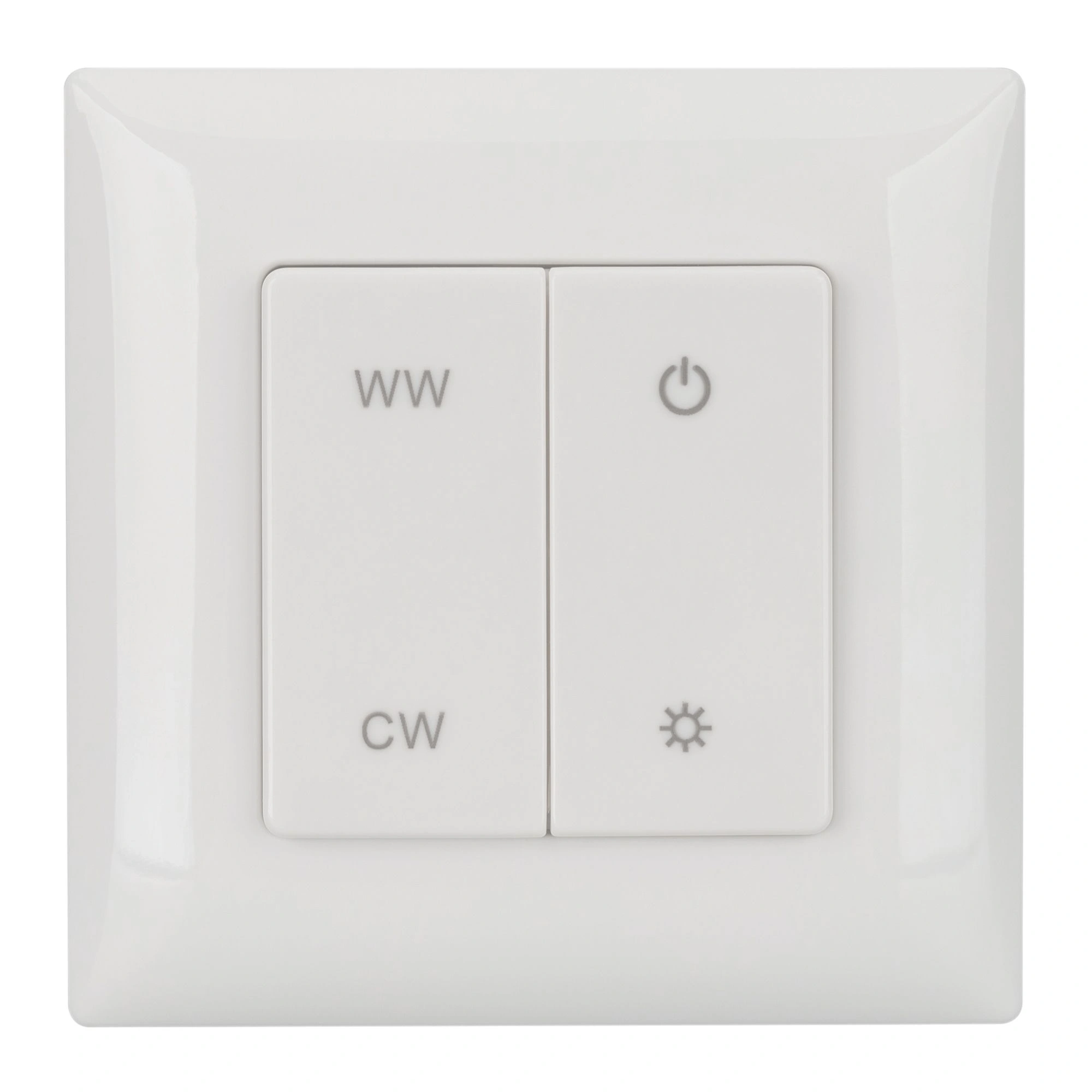 Накладная кнопочная панель белого цвета, изготовленная из пластика. Предназначена для управления мультибелыми (MIX) источниками света (ШИМ) с помощью кнопок. Основные выполняемые функции: включение и выключение света, регулировка яркости, изменение цветовой температуры. Удобное и точное управление с помощью эргономичных кнопок. Изделие применяется в качестве однозонного пульта дистанционного управления диммерами и контроллерами серии SMART. К одной панели возможно привязать неограниченное количество диммеров и контроллеров. Устройство совместимо с диммерами и контроллерами серии SMART, поддерживающими управление по радиоканалу 2.4G. Питание 3В осуществляется от батарейки CR2032. Габариты панели 86х86х14 мм, корпус выполнен из пластика, лицевая часть - из пластика. Устройство устанавливается на любую поверхность, к которой возможно прикрутить монтажную базу панели.