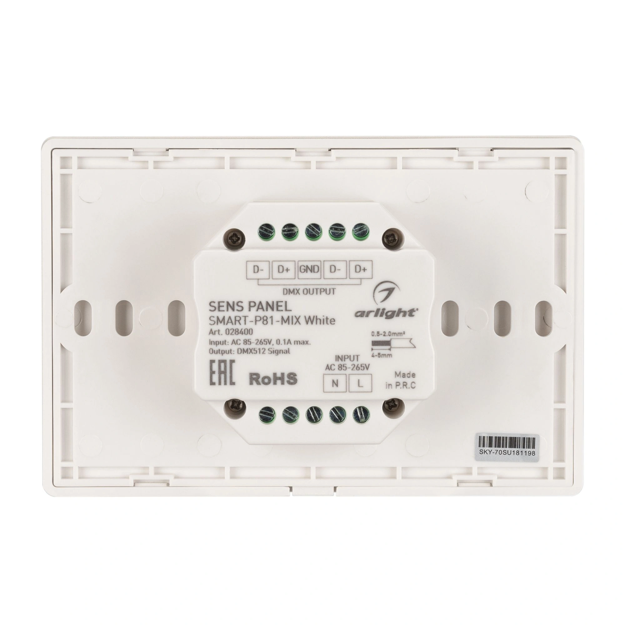 Встраиваемая сенсорная панель в "итальянском" стиле, изготовленная из высококачественного стекла, защищенного от появления царапин. Изделие позволяет осуществлять основные функции управления светом: включение/выключение, регулировка яркости, регулировка цветовой температуры, сохранение предустановок для 4 световых зон. Панель совместима с диммерами и контроллерами SMART по радиоканалу 2.4G (количество привязываемых диммеров и контроллеров не ограничено) и может управлять DMX-диммерами по проводной шине DMX512. Выходной сигнал DMX соответствует стандартному протоколу DMX512 и совместим с оборудованием DMX любого производителя. Панель белого цвета, питание от сети 230В. Габариты устройства 120х80х37 мм, встраивается в стандартную монтажную коробку.