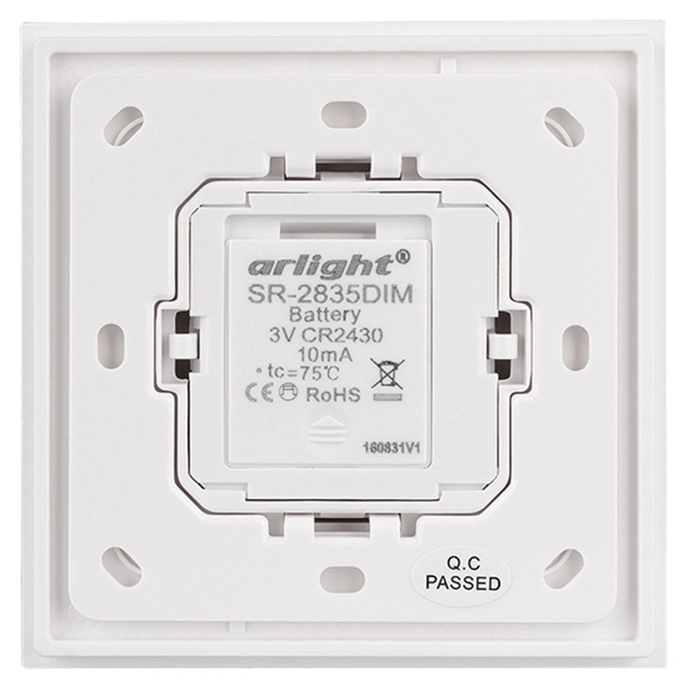 Накладная поворотная панель на стену для с/д одноцветных лент. Работает вместе с контроллерами серии SR-1009x. Управление по радиоканалу. Питание - 3V батарея CR2430. Размеры 86x86x27 mm. Подходят рамки GIRA S-55, E2, Event, Esprit.