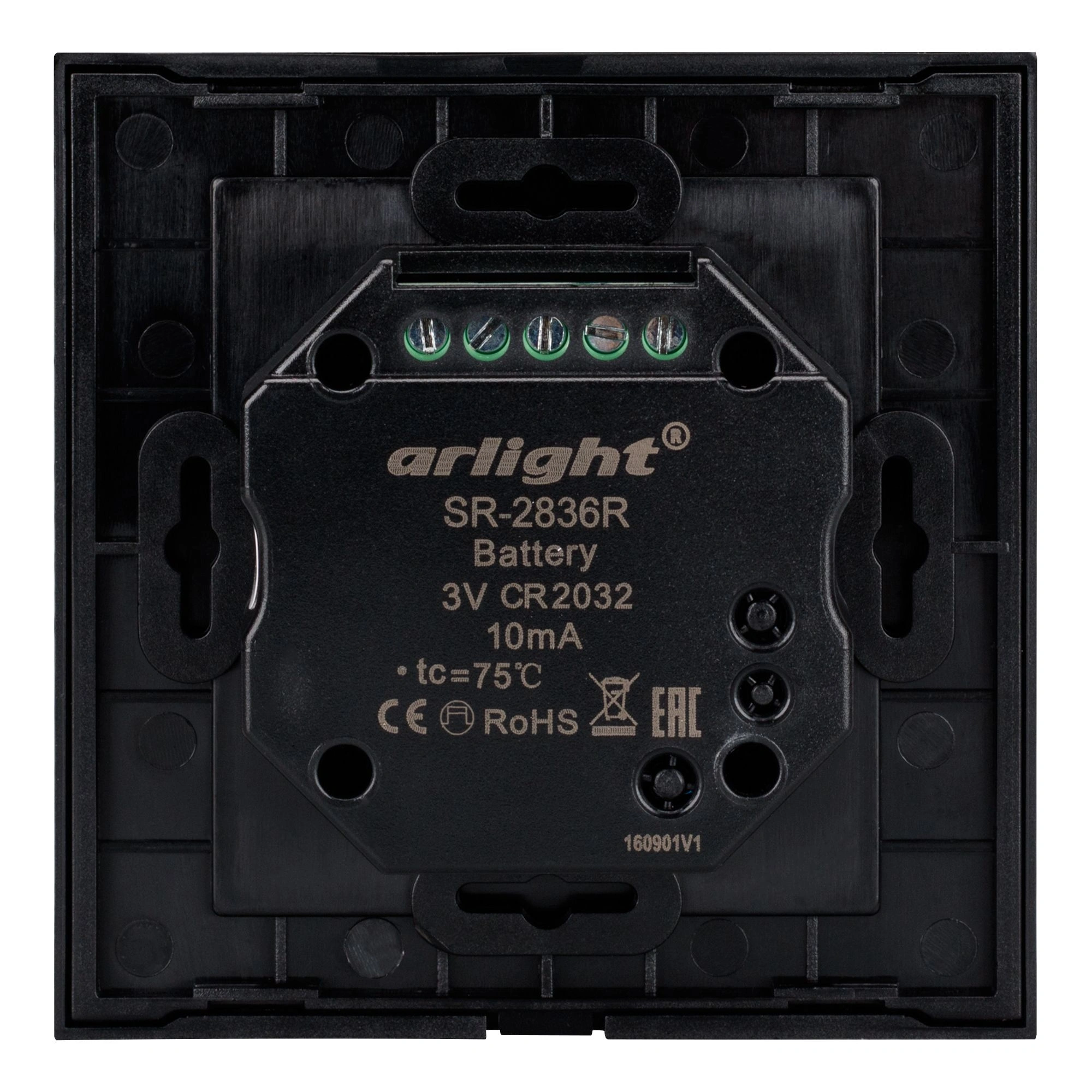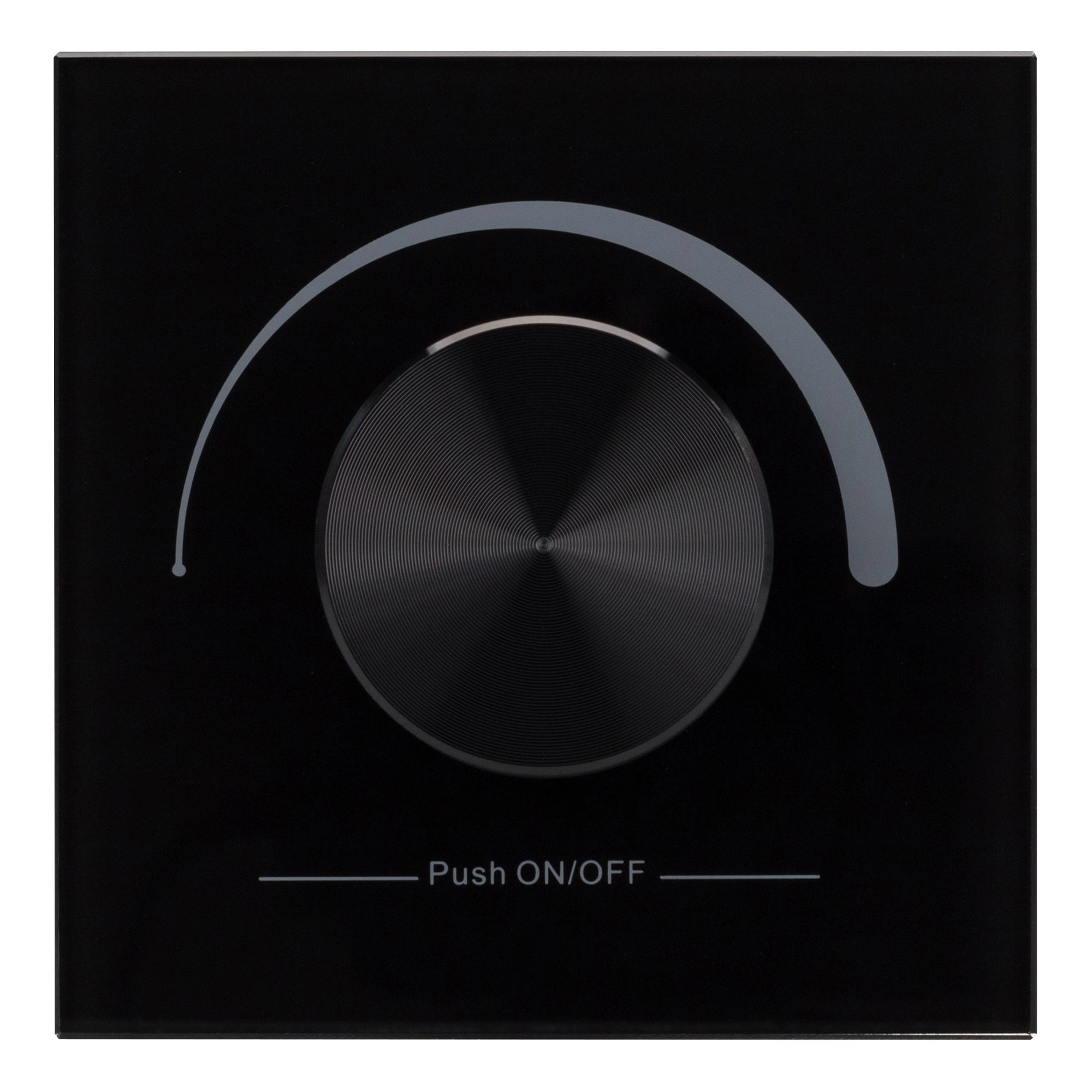 Встраиваемая роторная панель чёрного цвета для управления диммерами серий SR, Excellent. Позволяет осуществлять включение/выключение источников света, реуглировку их яркости. Питание панели осуществляется от 3В батарейки CR2032. Габариты составляют 86х86х45 мм, корпус чёрного цвета, лицевая часть рамки панели - стекло.