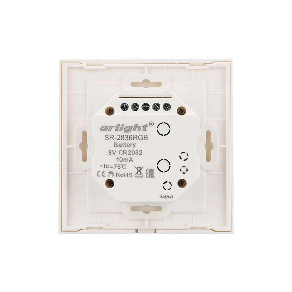 Встраиваемая роторная панель белого цвета для управления RGB-контроллерами серий SR, Excellent. Позволяет осуществлять включение/выключение источников света, реуглировку их яркости, управление цветом (RGB). Питание панели осуществляется от 3В батарейки CR2032. Габариты составляют 86х86х45 мм, корпус белого цвета, лицевая часть рамки панели - стекло.