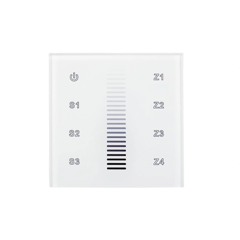 Встраиваемая сенсорная панель для с/д одноцветных лент. Работает вместе с контроллерами серии SR-1009x. Стеклянная Touch-панель, цвет белый. Управление 4 зонами по радиоканалу. Питание 220V. Размер 86x86x29 мм. Аналогичные по дизайну панели в серии SMART (устройства не совместимы).