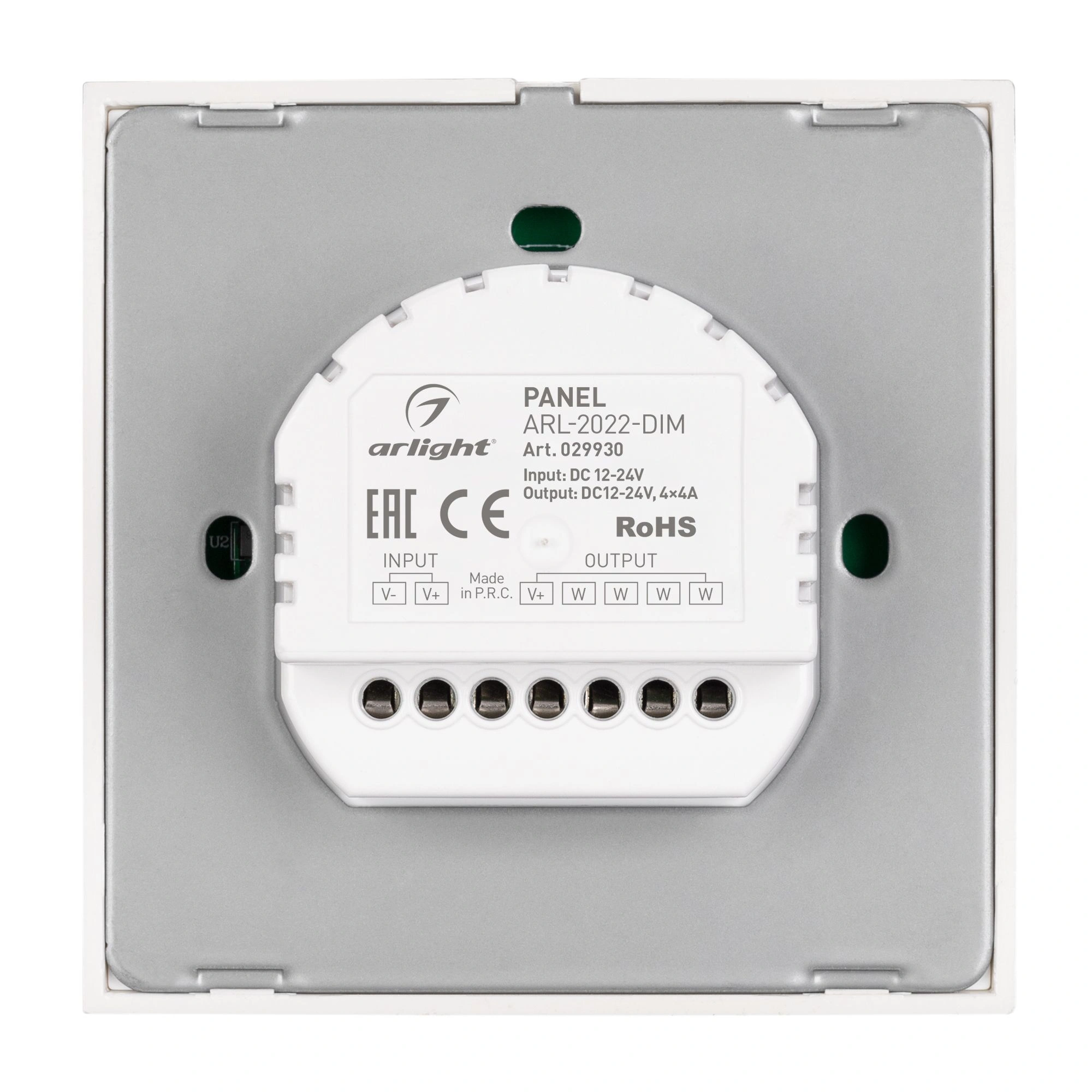 Встраиваемая сенсорная панель (Европейский стандарт) для управления одноцветными светодиодными лентами, цвет белый. 4 параллельных канала, питание DC 12-24V, ток нагрузки 4x4A, мощность нагрузки 192-384W. Габариты 86х86х33 мм.