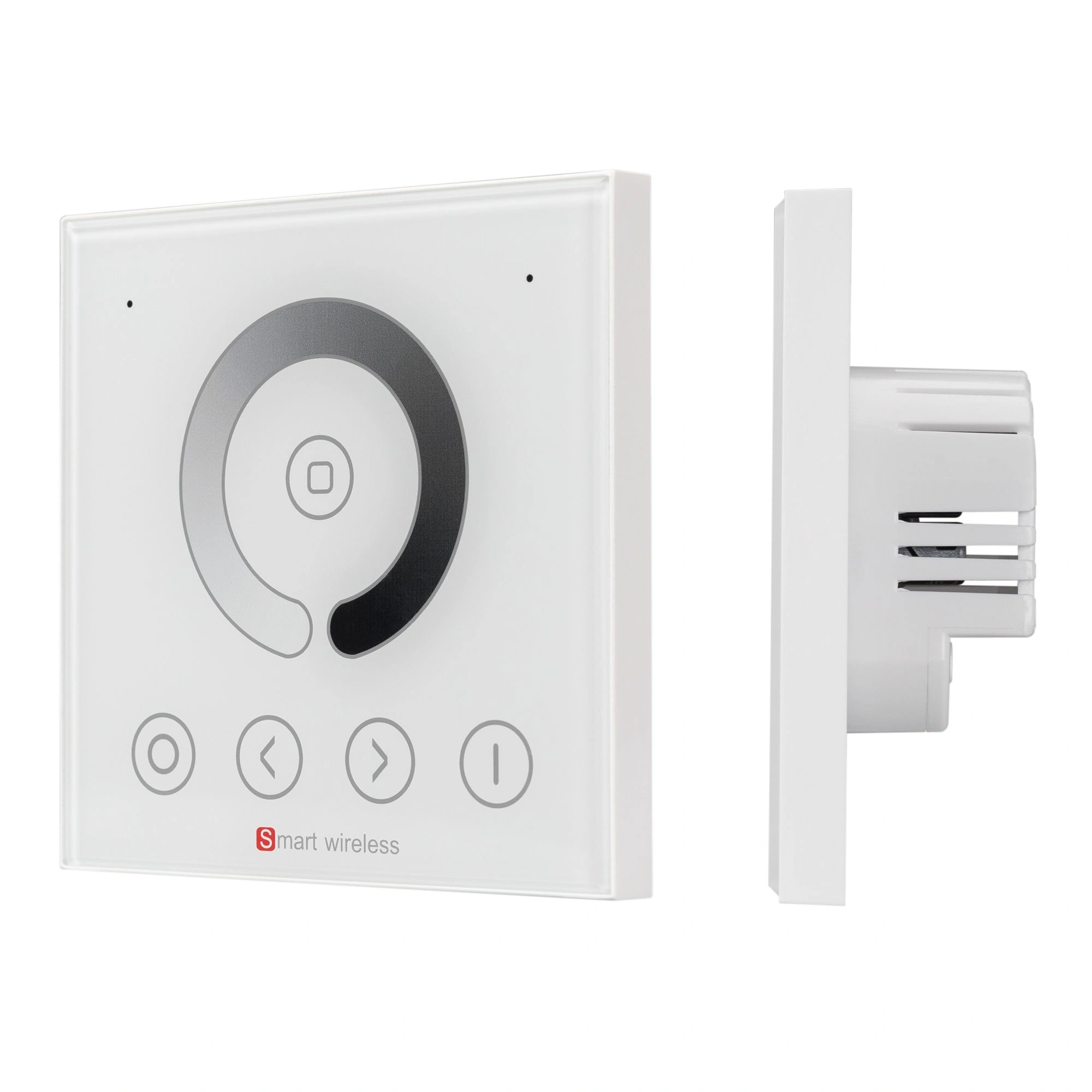 Настенная сенсорная панель со стекляным покрытием предназначена для встройки в стандартный подрозетник. С помощью панели возможно управление одноцветной светодиодной лентой - включение/выключение, регулировка яркости. Панель имеет сенсорный круг для точного и легкого изменения яркости ленты, кнопки переключения между 4-мя параллельными каналами, а также кнопки включения и выключения света. Изделие выполнено в белом цвете из высококачественного стекла, устойчивого к появлению мелких царапин и сколов. Питание панели имеет диапазон напряжений от 12В до 24В, максимальный ток 4А на 1 канал, максимальная мощность 192-384Вт (в зависимости от напряжения питания). Габариты панели составляют 86х86х33мм.