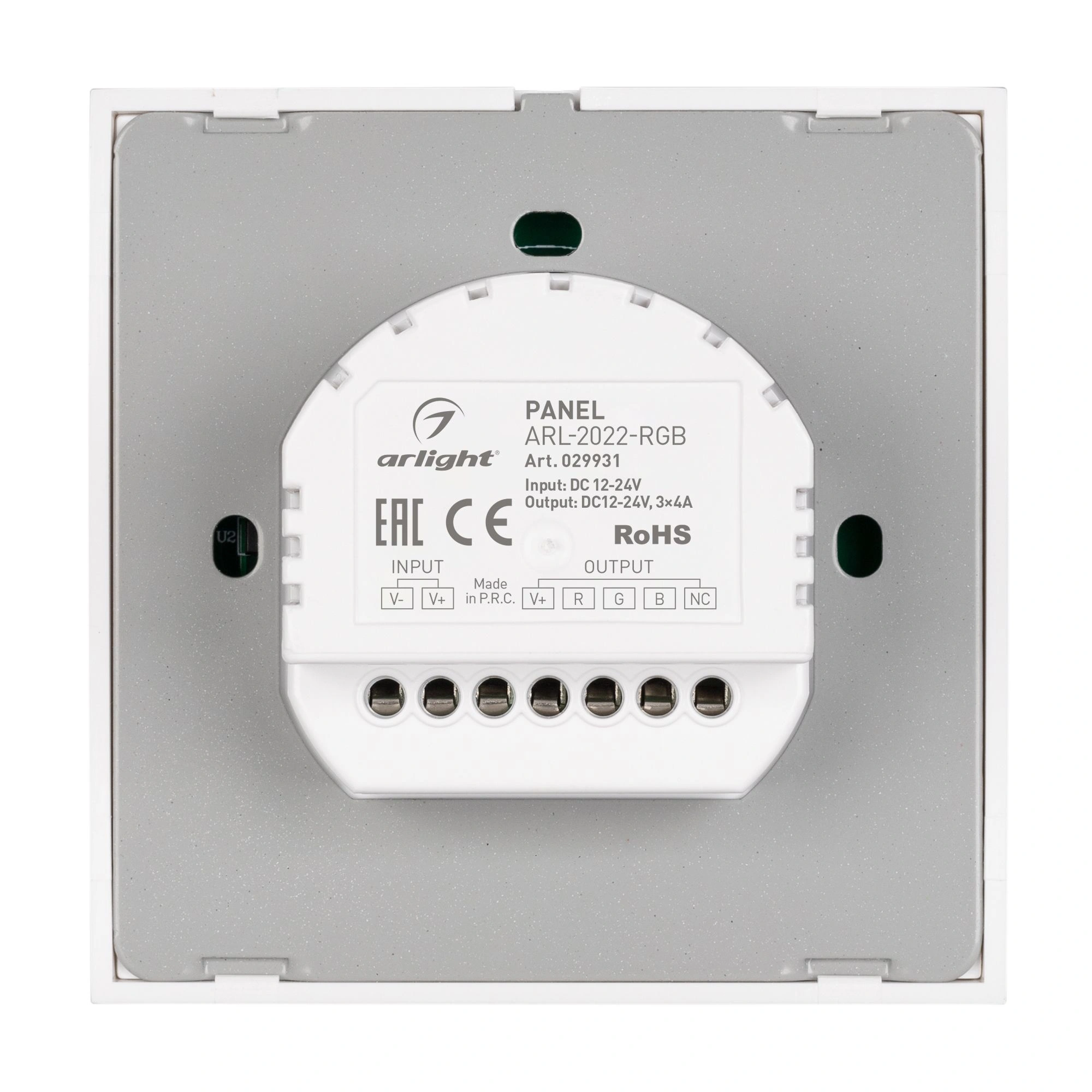 Встраиваемая сенсорная панель (Европейский стандарт) для управления RGB светодиодными лентами, цвет белый. 3 канала, питание DC 12-24V, ток нагрузки 3x4A, мощность нагрузки 144-288W. Габариты 89х89х40 мм.