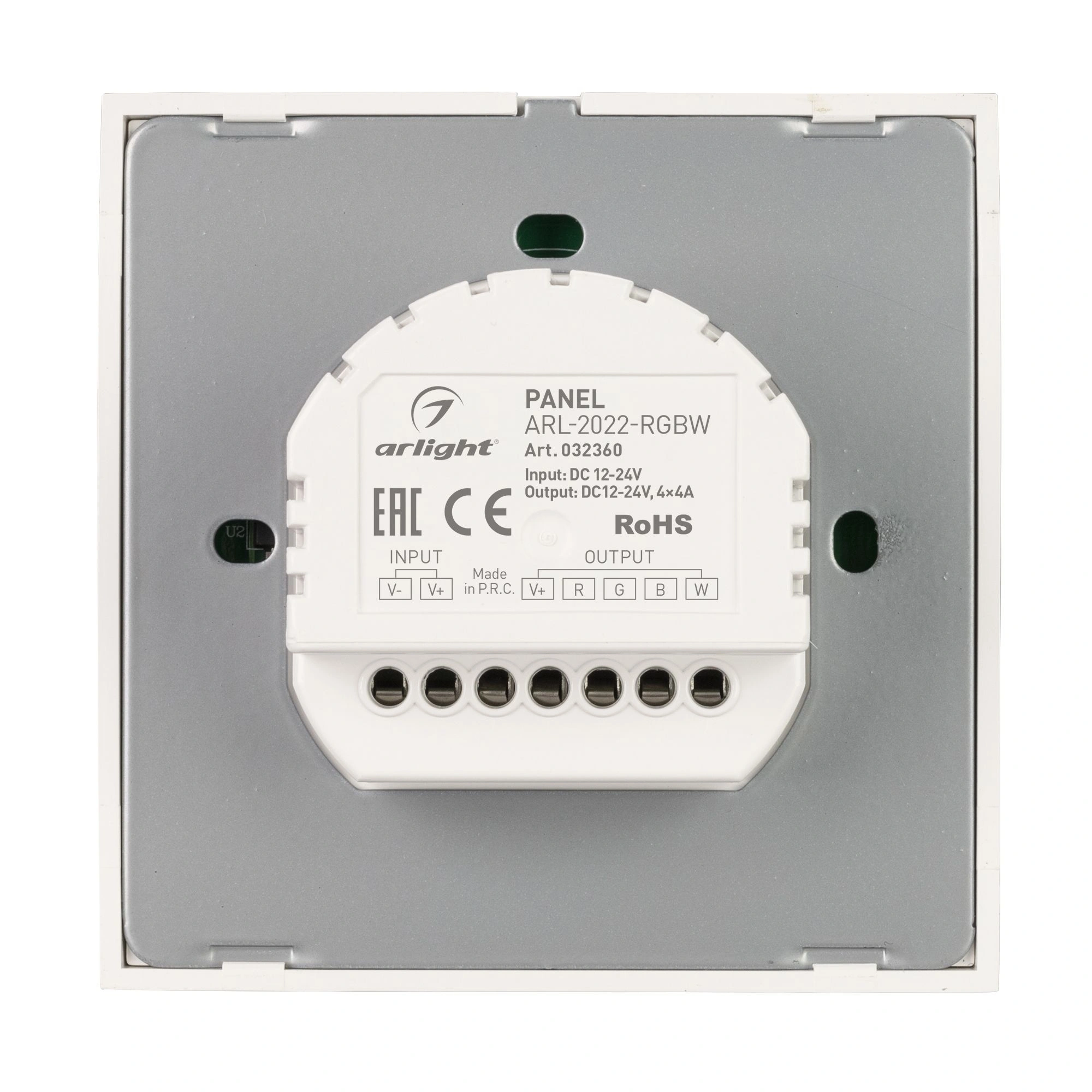 Встраиваемая сенсорная панель (Европейский стандарт) для управления RGBW светодиодными лентами, цвет белый. 4 канала, питание DC 12-24V, ток нагрузки 4x4A, мощность нагрузки 192-384W. Габариты 89х89х40 мм.