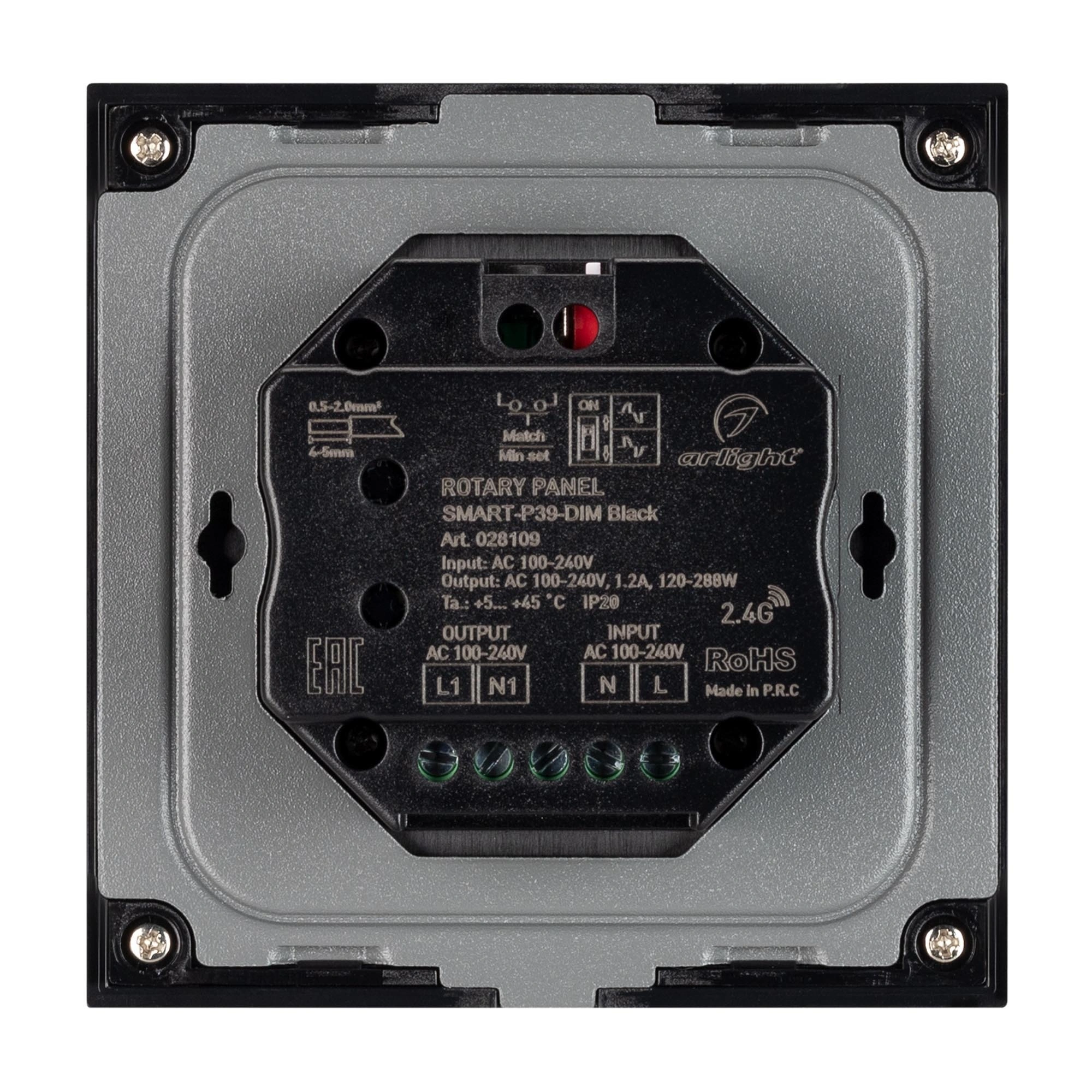 Встраиваемая роторная панель чёрного цвета, предназначенная для управления светодиодными или другими источниками света с напряжением питания 230В. Панель позволяет включать и выключать свет и регулировать его яркость. Удобное и точное управление при помощи вращающегося регулятора. Стильный и современный дизайн, позволяющий устанвливать панель в большинство типов подрозетников и сочетающийся с большинством интерьеров. Панелью можно управлять пультами ДУ и другими панелями серии SMART по радиоканалу 2.4G. Возможна привязка до 10 пультов или панелей управления. Питание 230В, максимальный выходной ток 1.2А, максимальная мощность 288 Вт. Габариты устройства 86х86х50 мм. Панель выполнена из стекла, устойчивого к появлению царарин и загрязнения. Устанавливается в стандартную монтажную коробку.