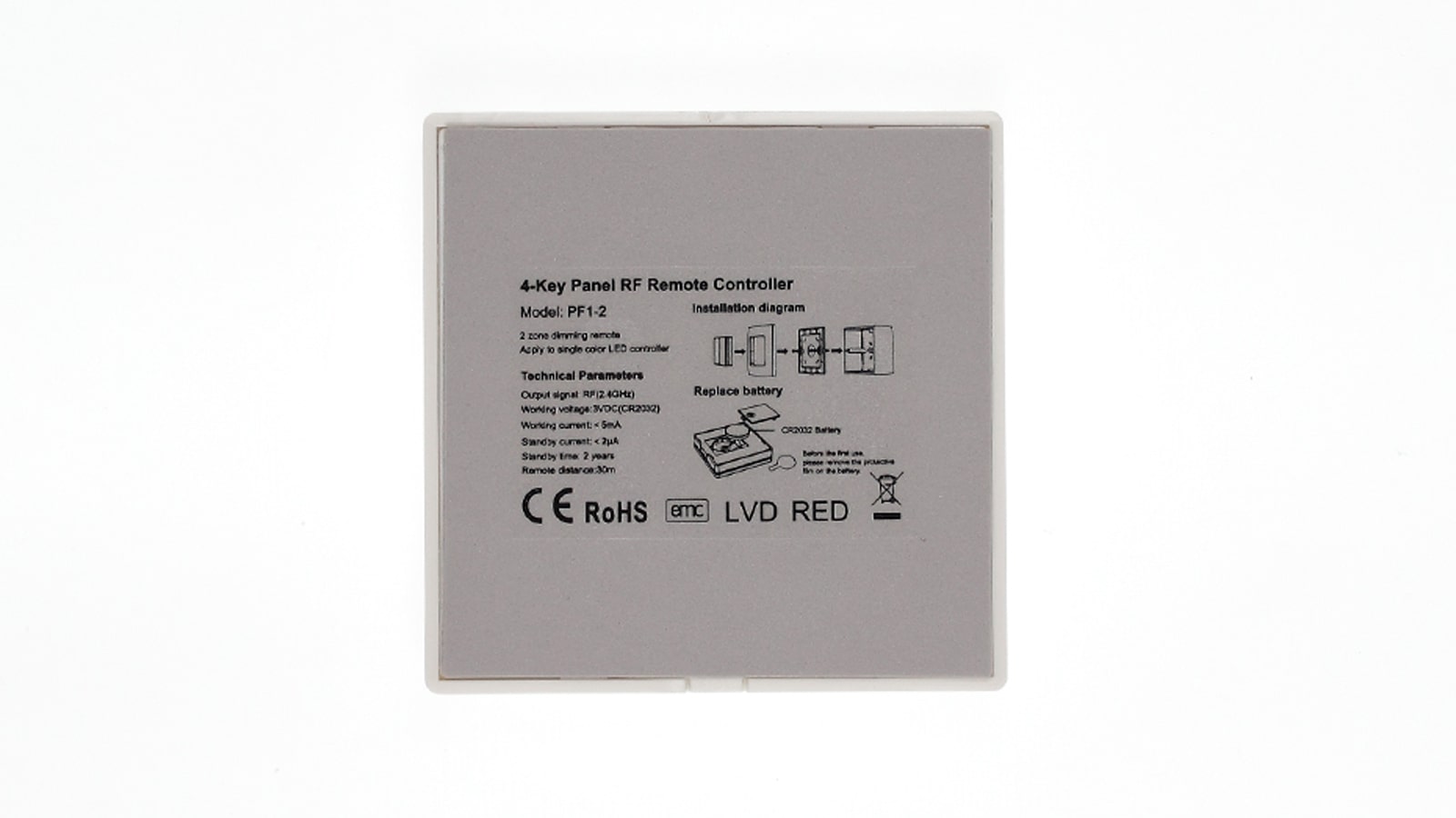 Накладная панель DIM белого цвета. Для регулировки уровня яркости одноцветной ленты.Поддержка 2-х зон управления. Питание 3V (CR2032), выходной сигнал RF 2.4GHz. Работает со всем оборудованием серии ICLED PRO. Дальность действия управления по радиосигналу до 30м (прямая видимость без препятствий). Рабочая температура от -30 до +55 градусов. Степень защиты IP20. Размер панели 86x86x14мм. Гарантия 5 лет. Размер упаковки 100x90x29мм. Вес 85г.