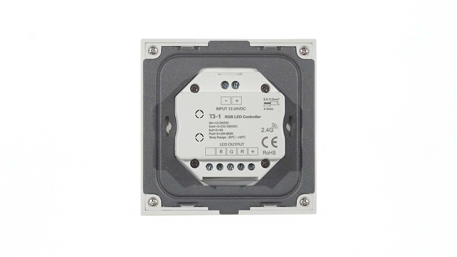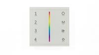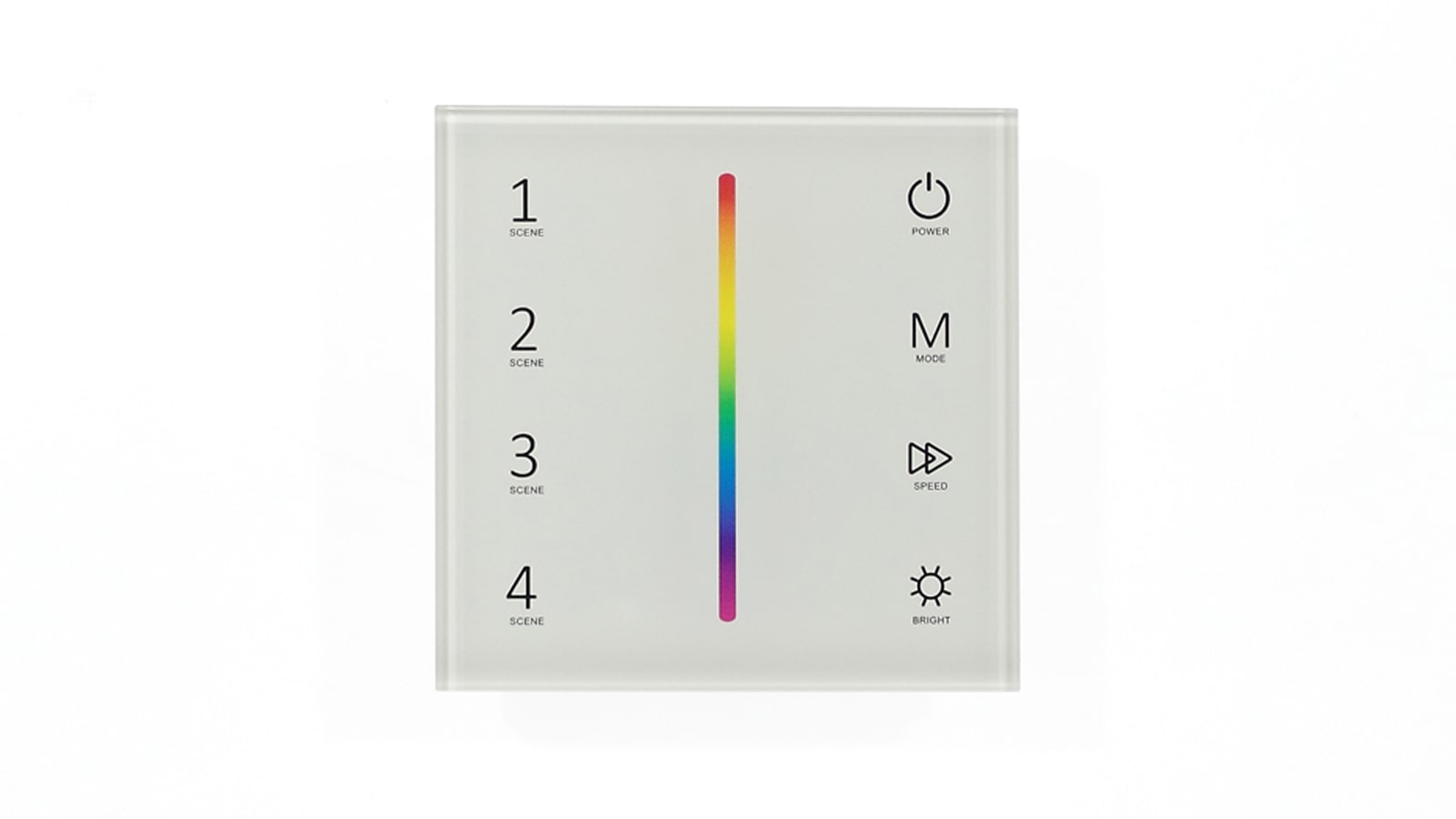 Встраиваемая сенсорная панель RGB белого цвета. Для управления многоцветной RGB лентой с возможностью регулировки яркости. Стеклянная лицевая панель. Поддержка до 4 запоминаемых предустановок. Работает со всем оборудованием серии ICLED PRO. Входное напряжение 12-24V, выходной ток 3х4А, максимальная выходная мощность (12В)- 3х48Вт, (24В)- 3х96Вт. выходной сигнал RF 2.4GHz. Дальность действия управления по радиосигналу до 30м (прямая видимость без препятствий). 256 уровней регулировки яркости от 0 до 100%. Установка в стандартный подрозетник. Рабочая температура от -30 до +55 градусов. Степень защиты IP20. Размер панели 86x86x34мм. Гарантия 5 лет. Размер упаковки 110x110x50мм. Вес 230г.