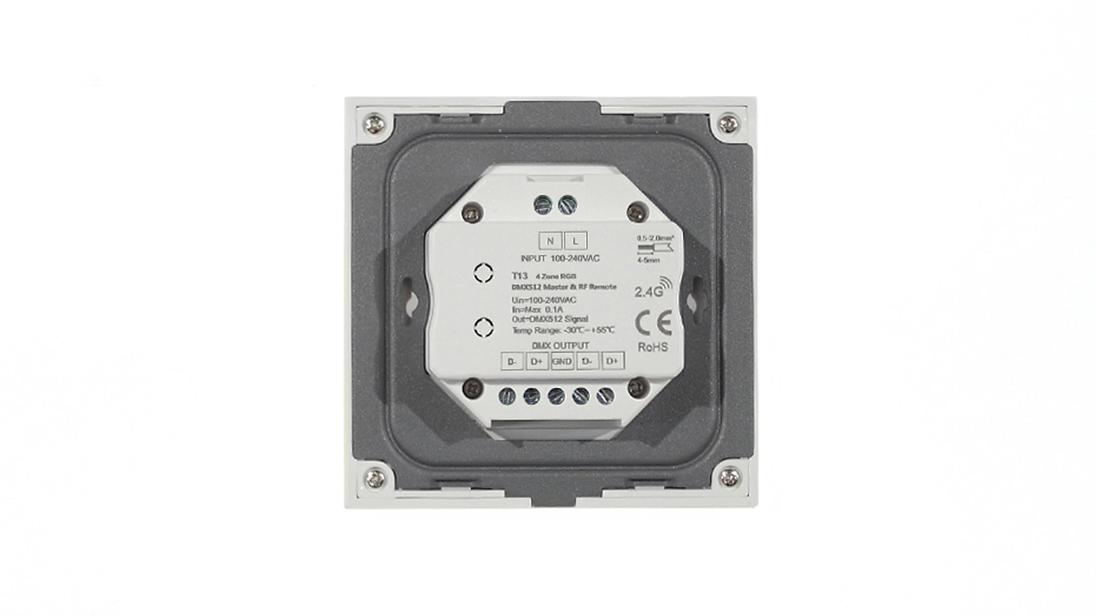 Встраиваемая сенсорная панель RGB белого цвета. Для управления многоцветной лентой с возможностью регулировки яркости. Стеклянная лицевая панель. Поддержка до 4-х зон управления. Входное напряжение 100-240V, выходной сигнал DMX512, RF 2.4GHz.Работает со всем оборудованием серии ICLED PRO. Дальность действия управления по радиосигналу до 30м (прямая видимость без препятствий). 256 уровней регулировки яркости от 0 до 100%. Установка в стандартный подрозетник. Рабочая температура от -30 до +55 градусов. Степень защиты IP33. Размер панели 86x86x34мм. Гарантия 5 лет. Размер упаковки 110x110x50мм. Вес 230г.