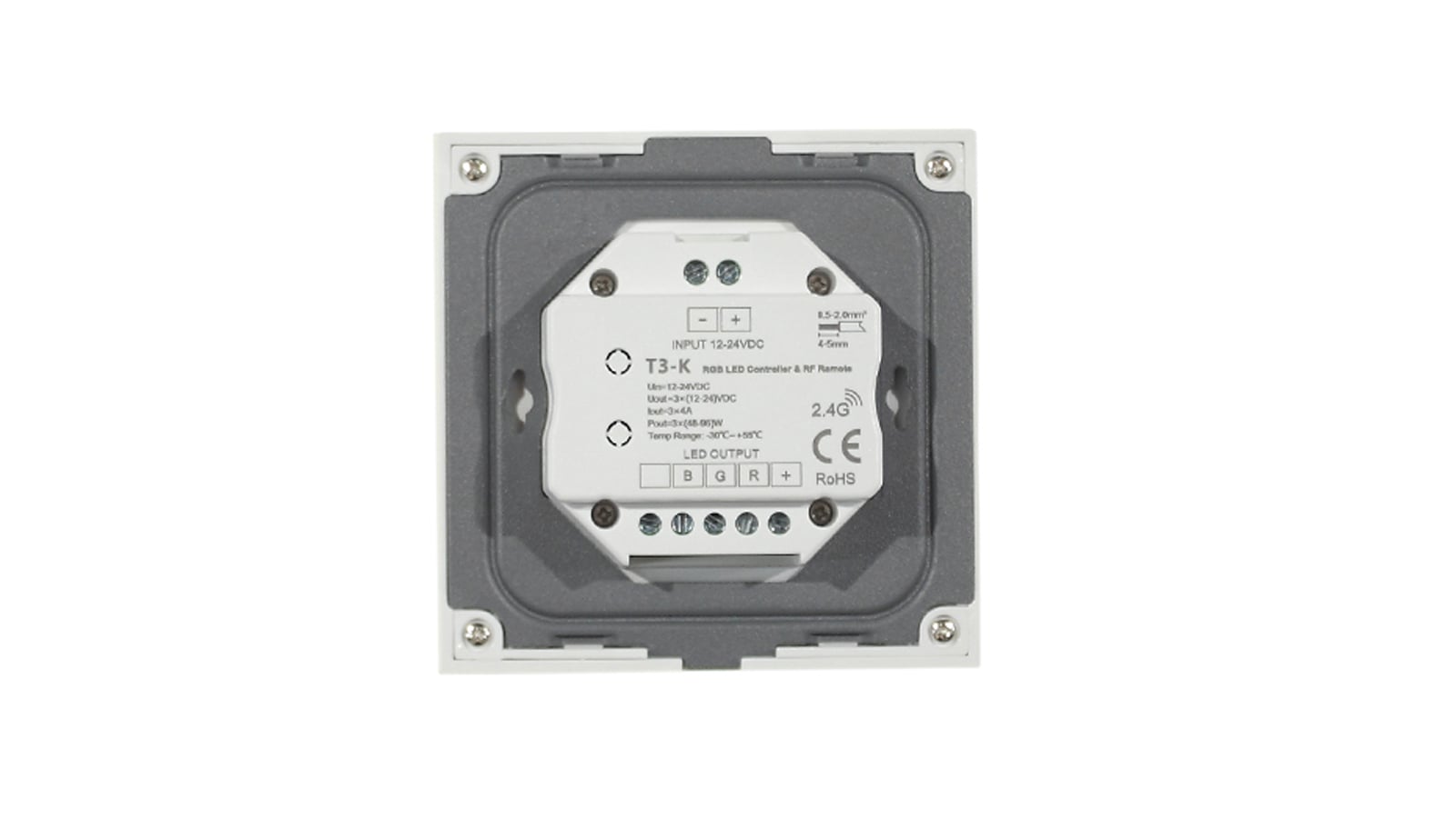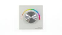 Поворотная панель RGB белого цвета. Для регулировки цвета свечения и уровня яркости RGB ленты. Стеклянная лицевая панель. Поддержка 1 зоны управления. Входное напряжение 12-24V, выход 3x4A, выходной сигнал RF 2.4GHz. Работает со всем оборудованием серии ICLED PRO. Дальность действия управления по радиосигналу до 30м (прямая видимость без препятствий). 256 уровней регулировки яркости от 0 до 100%. Установка в стандартный подрозетник. Рабочая температура от -20 до +55 градусов. Степень защиты IP33. Размер панели 86x86x50мм. Гарантия 5 лет. Размер упаковки 110x110x60мм. Вес 230г.