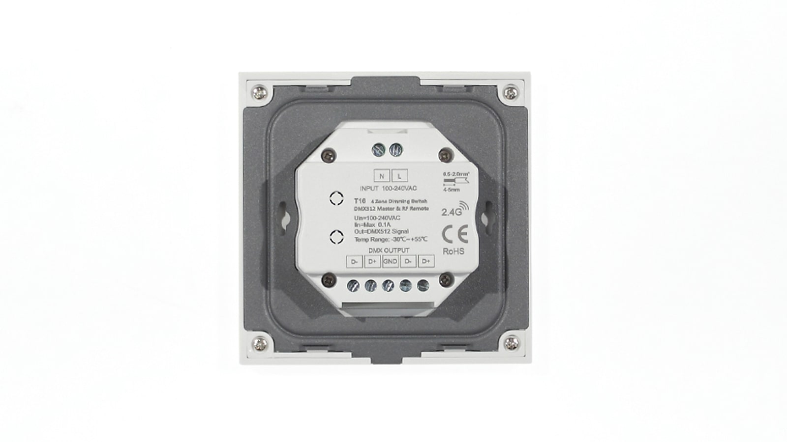 Встраиваемая сенсорная панель DIM белого цвета. Для регулировки уровня яркости одноцветной ленты. Стеклянная лицевая панель. Поддержка до 4-х зон управления. Входное напряжение 100-240V, выходной сигнал DMX512, RF 2.4GHz. Работает со всем оборудованием серии ICLED PRO. Дальность действия управления по радиосигналу до 30м (прямая видимость без препятствий). 256 уровней регулировки яркости от 0 до 100%. Установка в стандартный подрозетник. Рабочая температура от -30 до +55 градусов. Степень защиты IP33. Размер панели 86x86x34мм. Гарантия 5 лет. Размер упаковки 110x110x50мм. Вес 230г.
