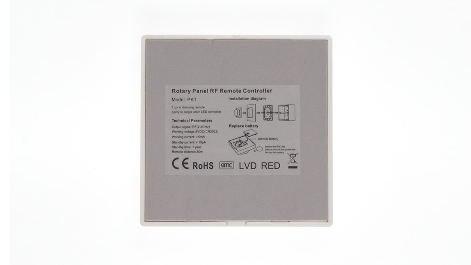 Накладная Rotary панель DIM белого цвета. Для регулировки уровня яркости одноцветной ленты.Поддержка 1 зоны управления. Питание 3V (CR2032), выходной сигнал RF 2.4GHz.Работает со всем оборудованием серии ICLED PRO. Дальность действия управления по радиосигналу до 30м (прямая видимость без препятствий). Рабочая температура от -30 до +55 градусов. Степень защиты IP20. Размер панели 86x86x23мм. Гарантия 5 лет. Размер упаковки 100x90x29мм. Вес 85г.
