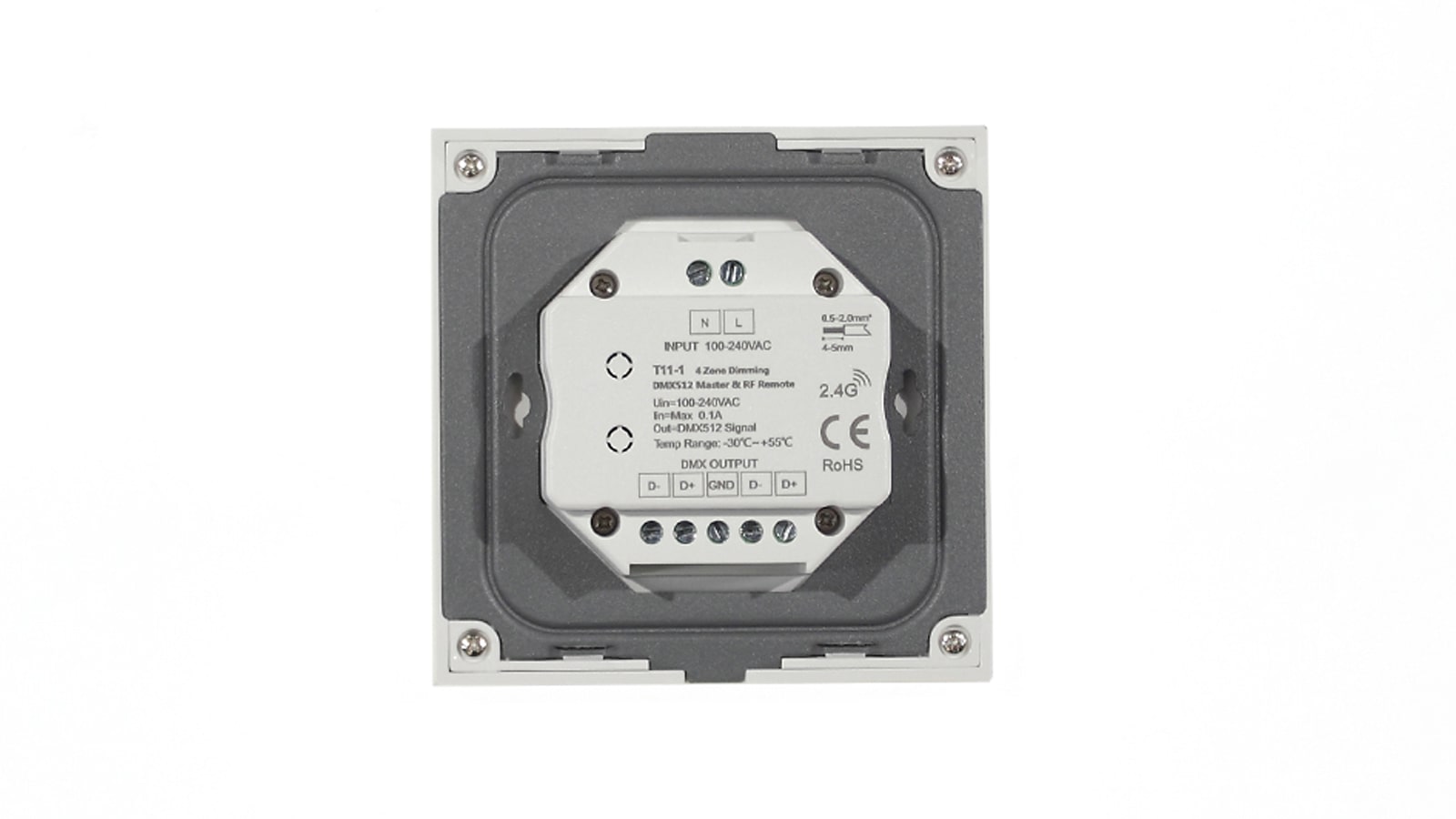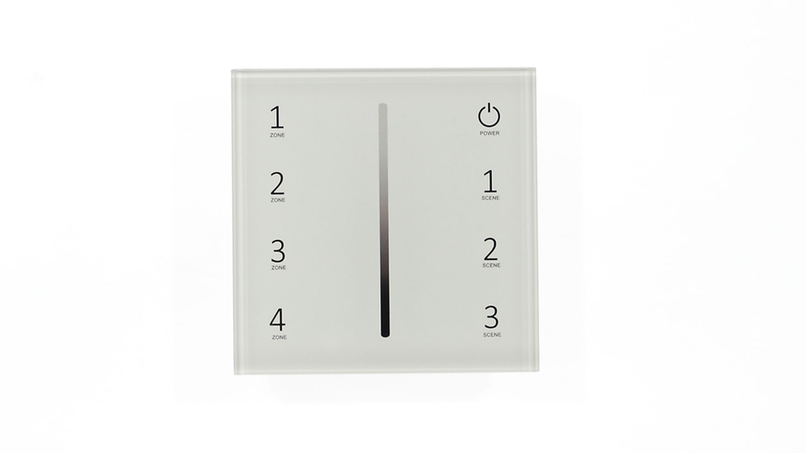 Встраиваемая сенсорная панель DIM белого цвета. Для регулировки уровня яркости одноцветной ленты. Стеклянная лицевая панель. Поддержка до 4-х зон управления. Входное напряжение 100-240V, выходной сигнал DMX512, RF 2.4GHz. Работает со всем оборудованием серии ICLED PRO. Дальность действия управления по радиосигналу до 30м (прямая видимость без препятствий). 256 уровней регулировки яркости от 0 до 100%. Установка в стандартный подрозетник. Рабочая температура от -30 до +55 градусов. Степень защиты IP33. Размер панели 86x86x34мм. Гарантия 5 лет. Размер упаковки 110x110x50мм. Вес 230г.