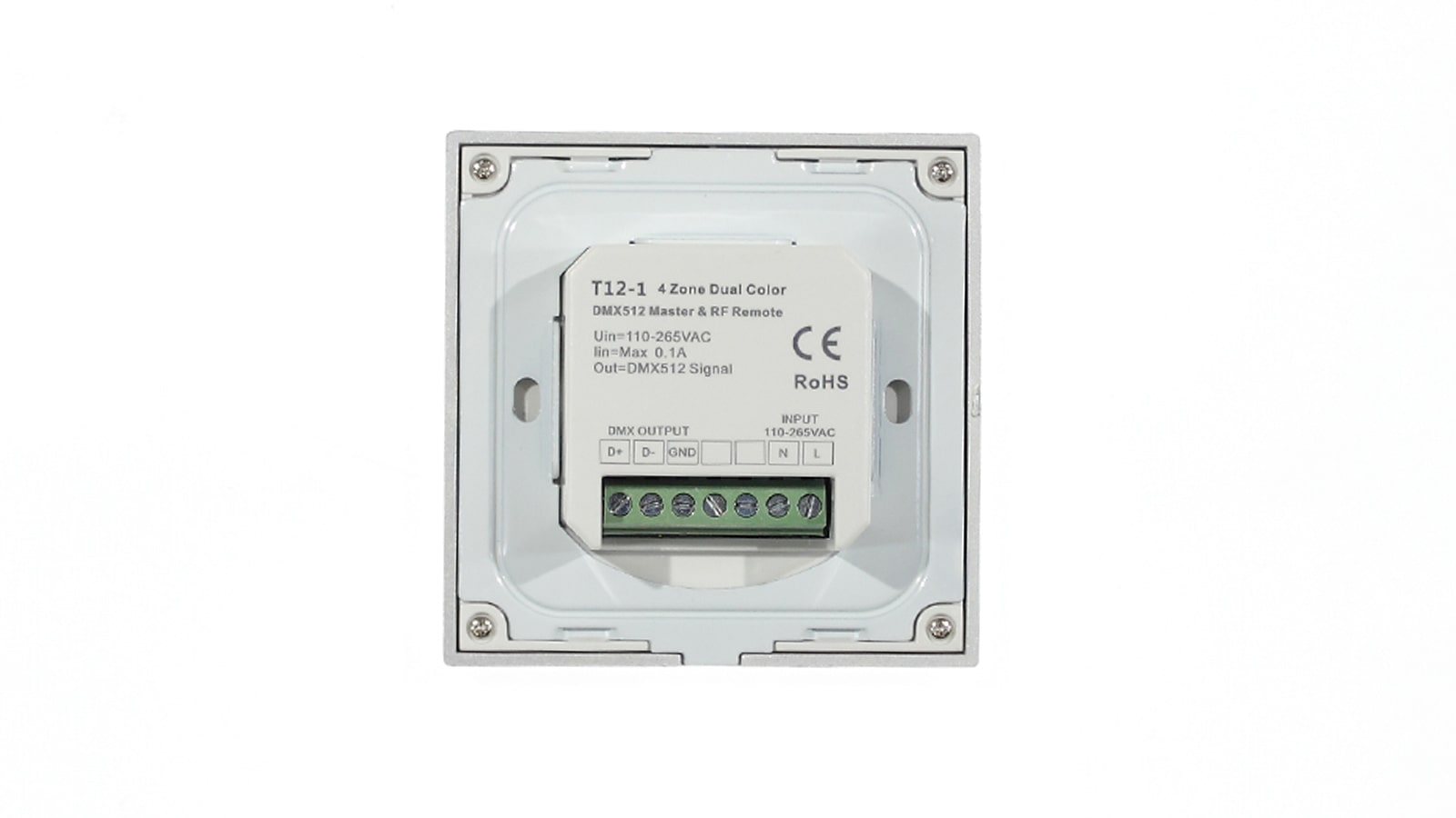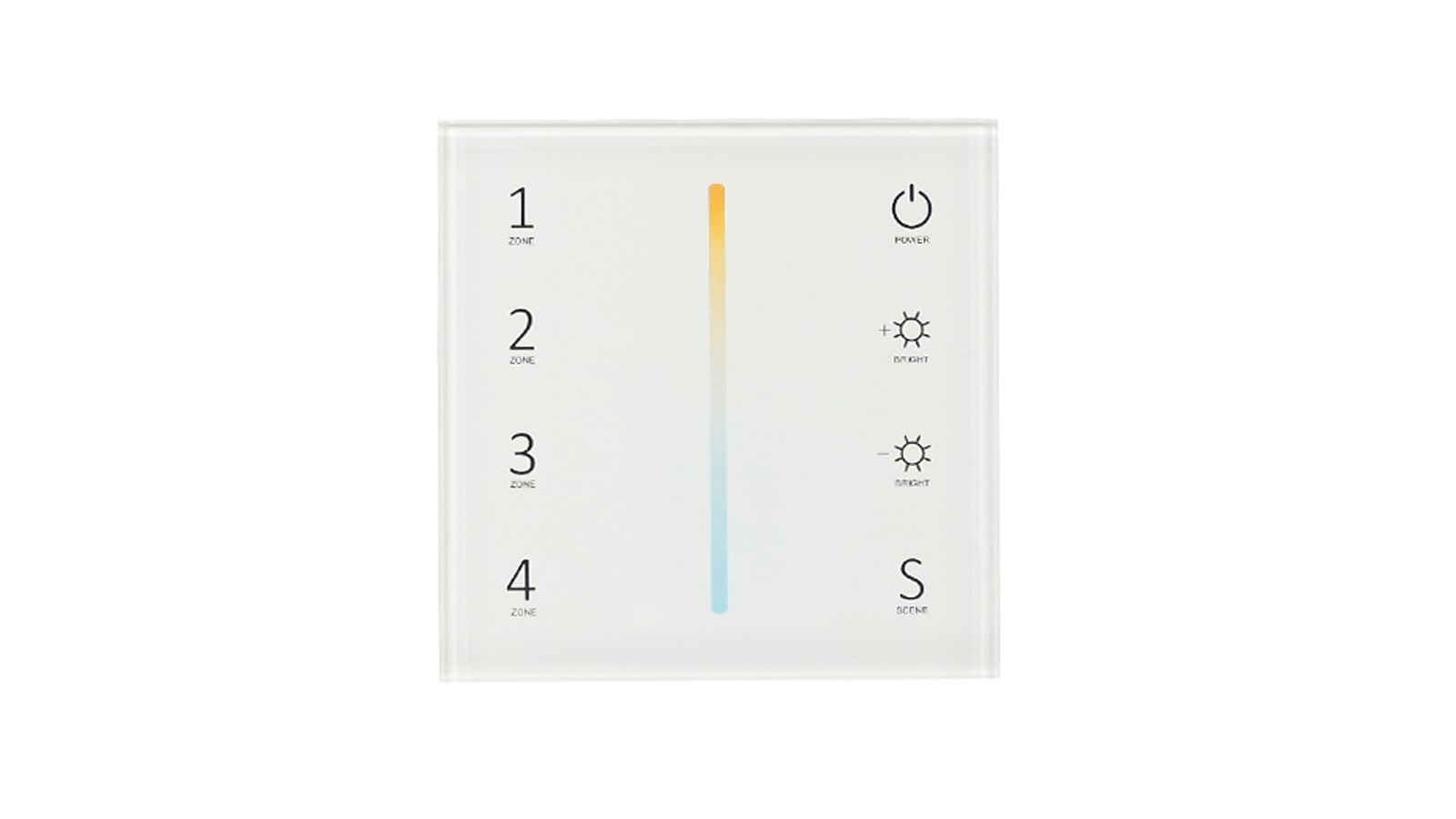 Встраиваемая сенсорная панель CCT белого цвета. Для выбора цветовой температуры белого цвета и регулировки яркости. Стеклянная лицевая панель. Поддержка до 4-х зон управления. Входное напряжение 100-240V, выходной сигнал DMX512, RF 2.4GHz.Работает со всем оборудованием серии ICLED PRO. Дальность действия управления по радиосигналу до 30м (прямая видимость без препятствий). 256 уровней регулировки яркости от 0 до 100%. Установка в стандартный подрозетник. Рабочая температура от -30 до +55 градусов. Степень защиты IP33. Размер панели 86x86x34мм. Гарантия 5 лет. Размер упаковки 110x110x50мм. Вес 230г.