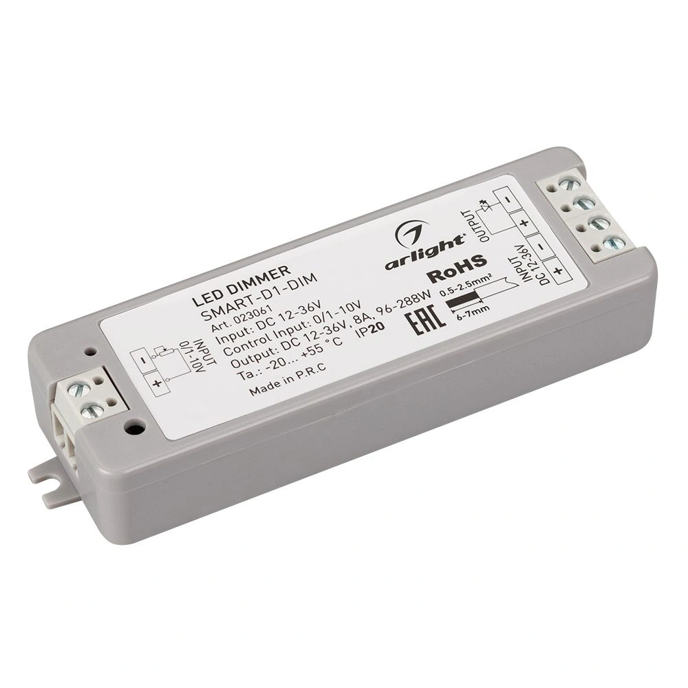 Диммер для одноцветных источников света (0/1-10V). Питание/рабочее напряжение 12-36VDC, входной/выходной ток 8А, выходная мощность 96-288W. Корпус - PVC. Габариты 97х33х18 мм.