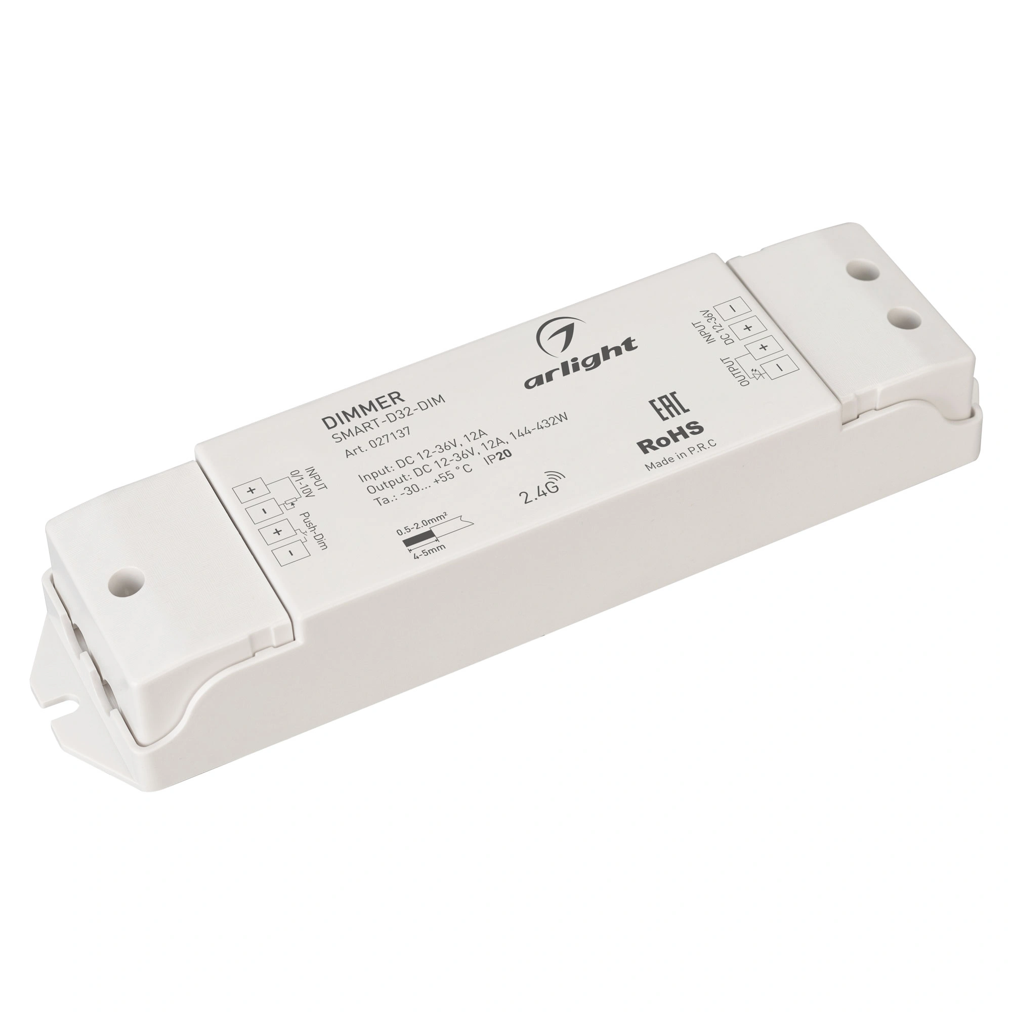 Диммер для одноцветных источников света (0/1-10V). Питание/рабочее напряжение 12-36VDC, входной/выходной ток 12А, выходная мощность 144-432W. Корпус - PVC. Габариты 175х45х27 мм. Управляется 0/1-10V панелями серии SMART (поставляются отдельно).