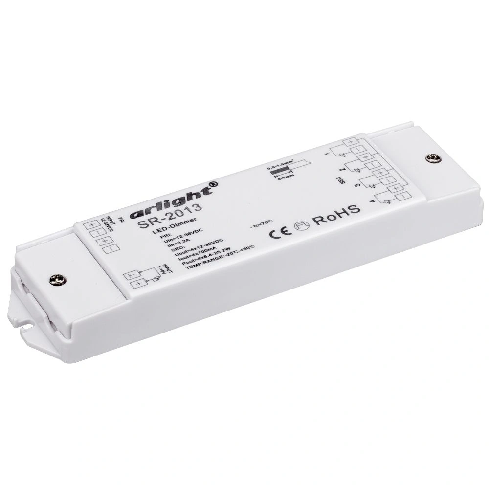 Диммер с входом 1-10V, 4 синхронных канала 700mA. Питание 12-36VDC. Ток 4x0.7A, Мощность 4x(8.4-25.2)W. Размеры 46x178x18мм. ПОД ЗАКАЗ.