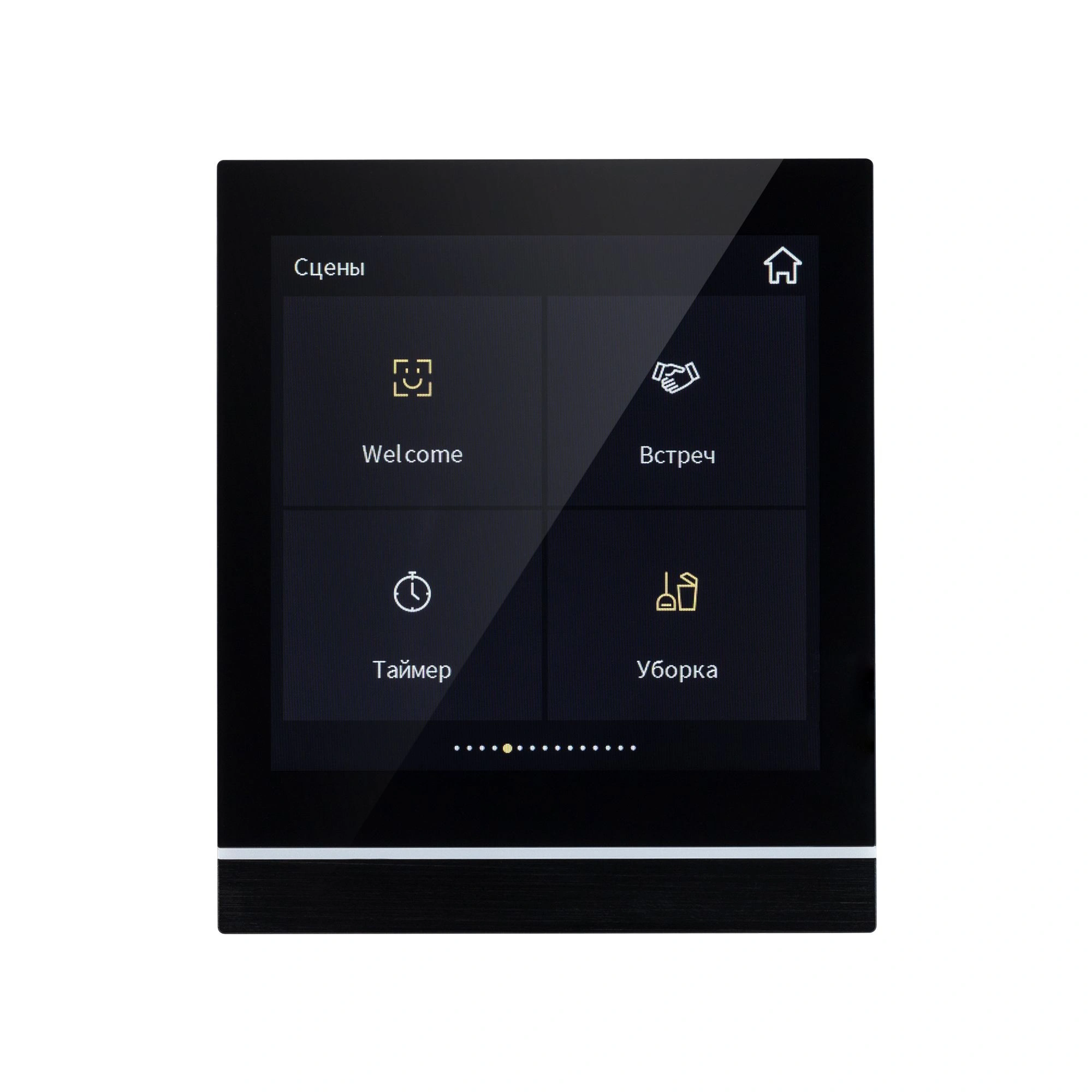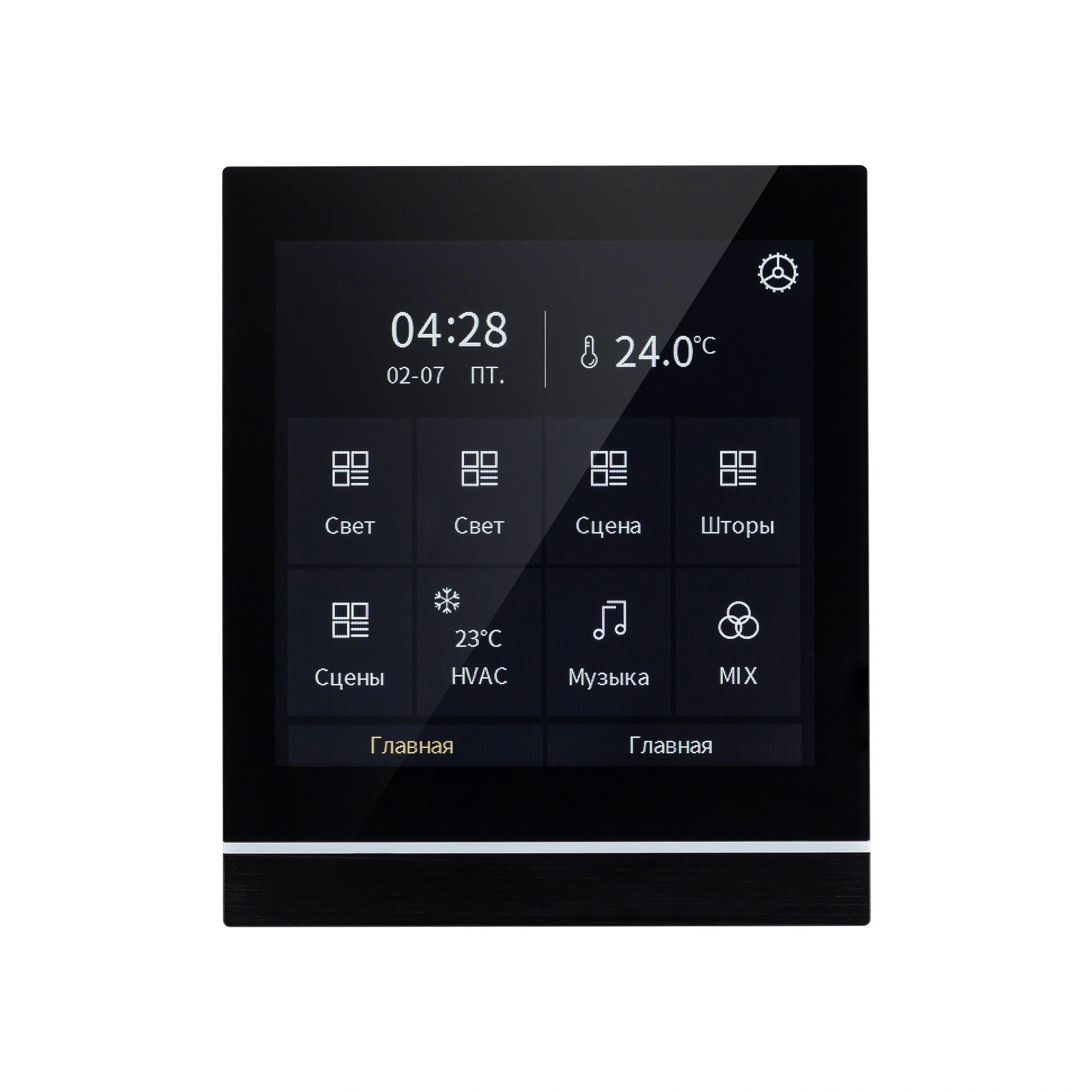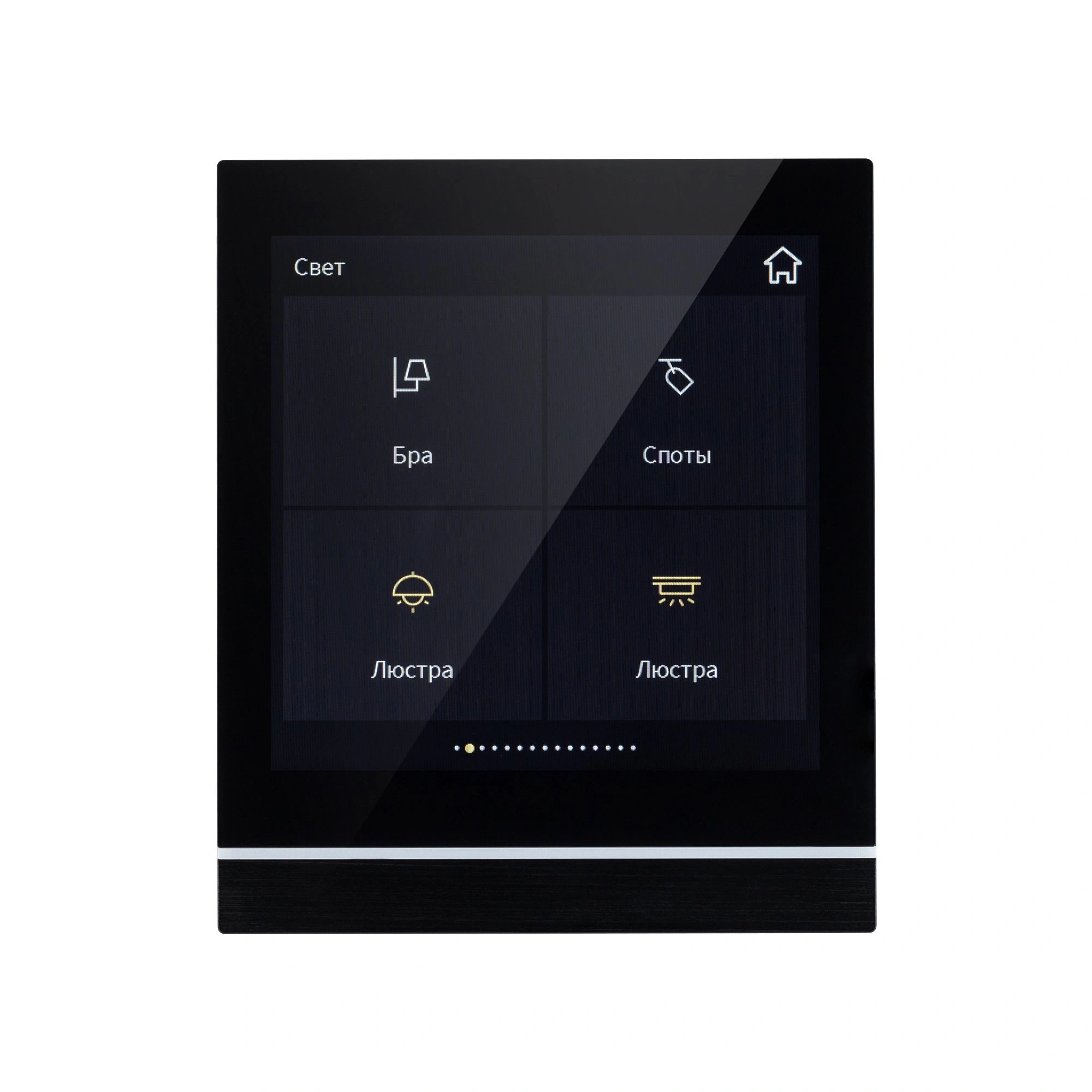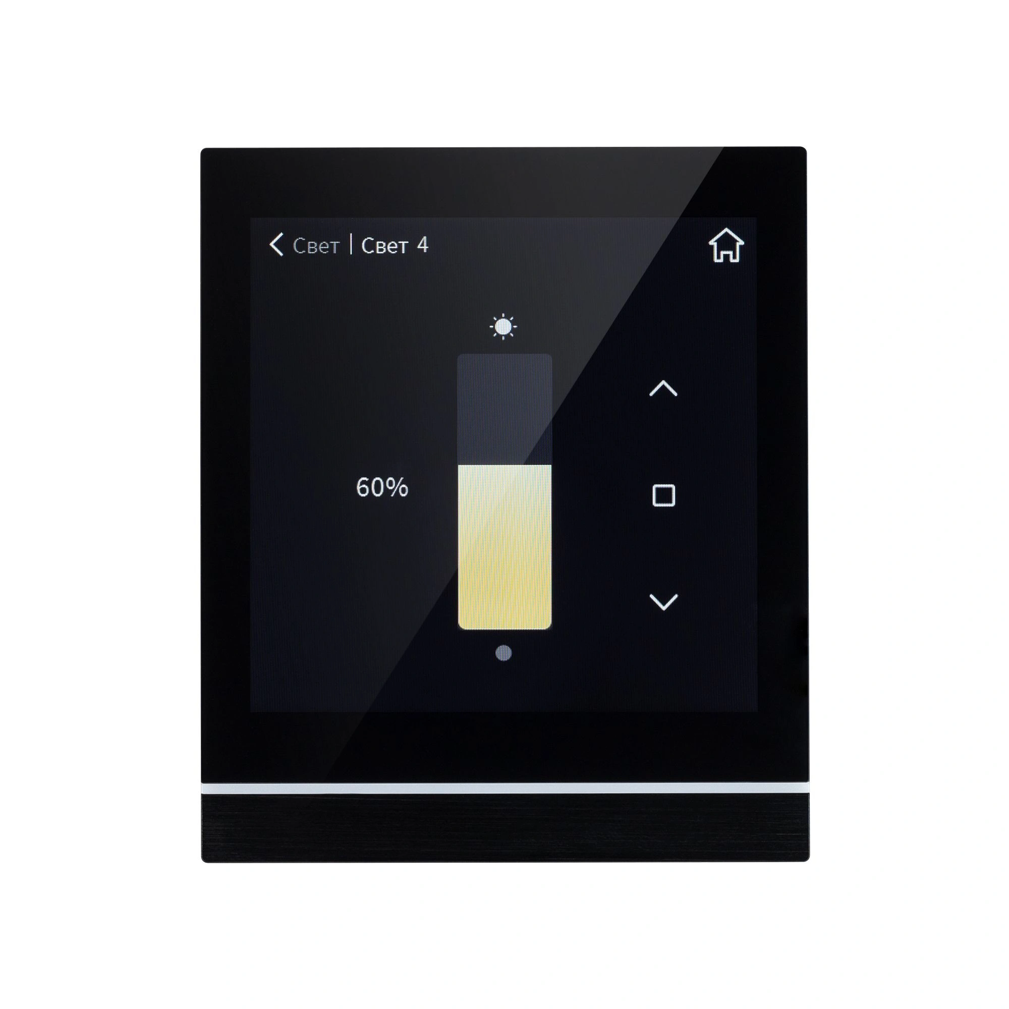 Многофункциональная страиваемая панель чёрного цвета с сенсорным управлением, предназначенная для включения и выключения световых сцен в системах управления светом KNX. Позволяет осуществлять включение/выключение, диммирование, управление шторами и жалюзи, управлять сценами. До 16 слайдов, на каждом до 8 элементов управления. Виджеты для RGBW, MIX (CCT), климатики, мультимедиа. Встроенный датчик температуры. Логические функции. Устройство совместимо с исполнительными устройствами стандарта KNX, в том числе, мировых производителей ABB, SCHNEIDER ELECTRIC, SIEMENS, ZENNIO и другими. Удобное и точное управление при помощи при помощи 4" сенсорного дисплея с разрешением 480х480. Напряжение питания 24-30В. Габариты устройства составляют 86x101x32 мм, установка в стандартную монтажную коробку. Пластиковый корпус, лицевая часть - стекло, цвет чёрный.