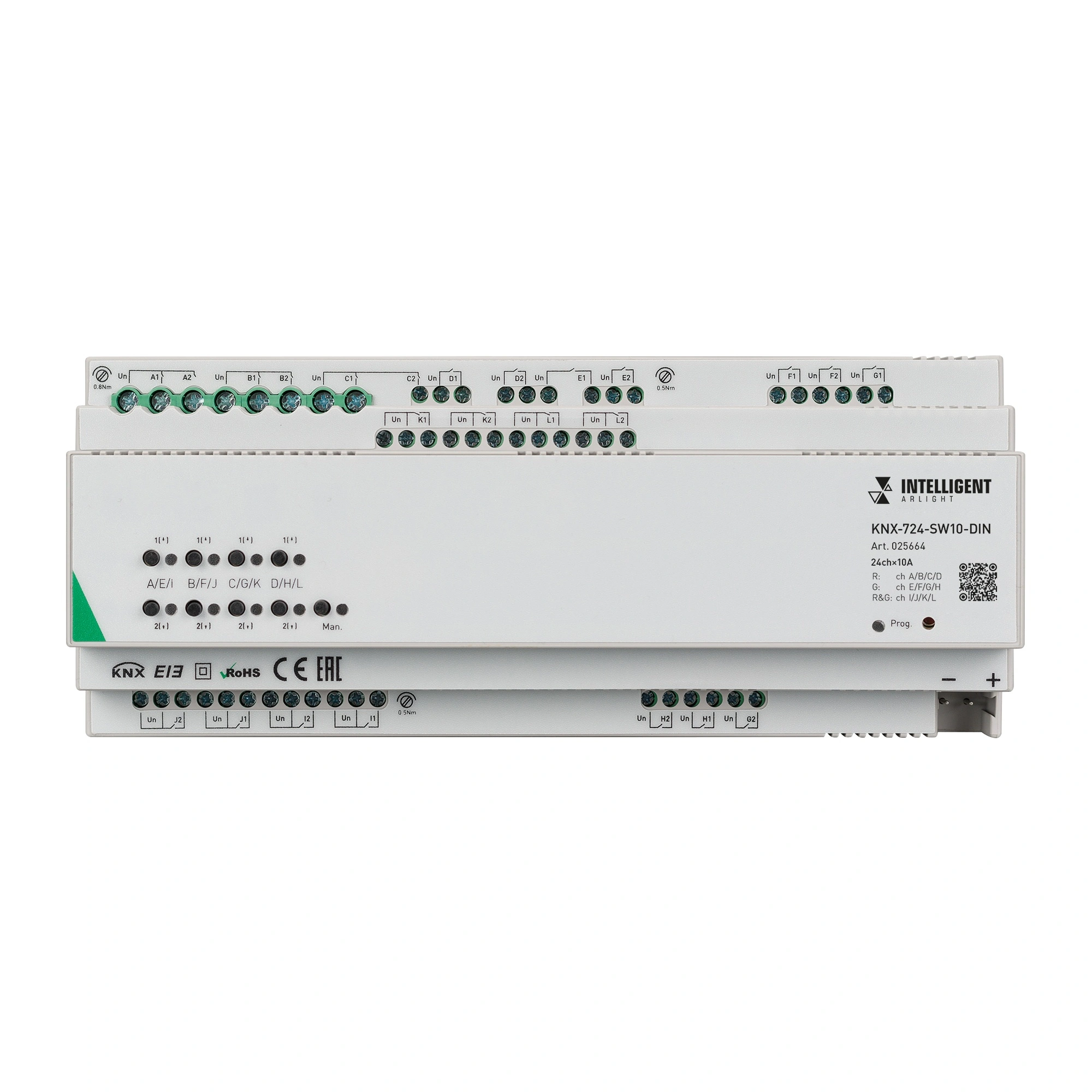 Релейный модуль, предназначенный для включения и выключения света в системах стандарта KNX, а также, использовать в качестве контроллера штор/жалюзи. Позволяет управлять нагрузкой различных типом путем смыкания/размыкания нормально разомкнутых контактов. Поддерживает стандартный протокол KNX и совместим с сертифицированным оборудованием KNX различных производителей: ABB, Schneider Electric, Siemens, Zennio и других. Программирование осуществляется через ПО ETS, версии не ниже 4.Х. Питание от шины KNX, 24 выходных универсальных канала коммутации вкл/выкл (либо 12 каналов управления шторами, либо сочетание этих режимов), максимальный ток 10А на канал, максимальная коммутируемая мощность одного канала для светодиодной нагрузки - 600 В*А. Габариты устройства 216х90х64 мм, установка на DIN-рейку. Заменяется на 049900.