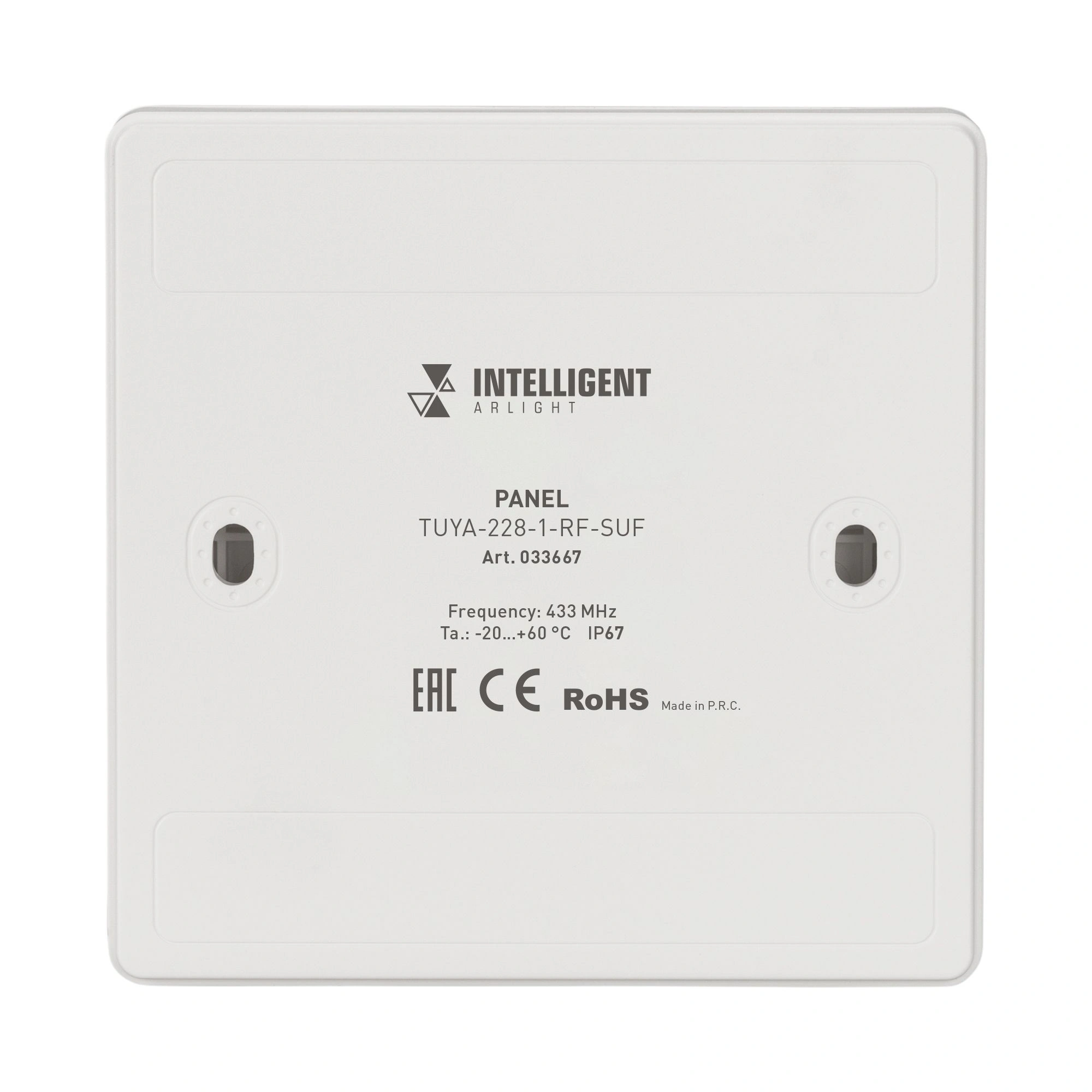 Накладная кнопочная панель белого цвета, изготовленная из пластика. Предназначена для управления одноцветными источниками света (ШИМ) с помощью кнопок. Основные выполняемые функции: включение и выключение света, регулировка яркости. Удобное и точное управление с помощью эргономичных кнопок. Изделие применяется в качестве однозонного пульта дистанционного управления диммерами и релейными модули серий TUYA-***-WF и TY-***-WF, поддерживающими управление по радиоканалу 433MHz. Не требует питания, имеет встроенный кинетический источник питания. Габариты панели 86х86х14 мм, корпус выполнен из пластика. Устройство устанавливается на любую поверхность, к которой возможно прикрутить монтажную базу панели.