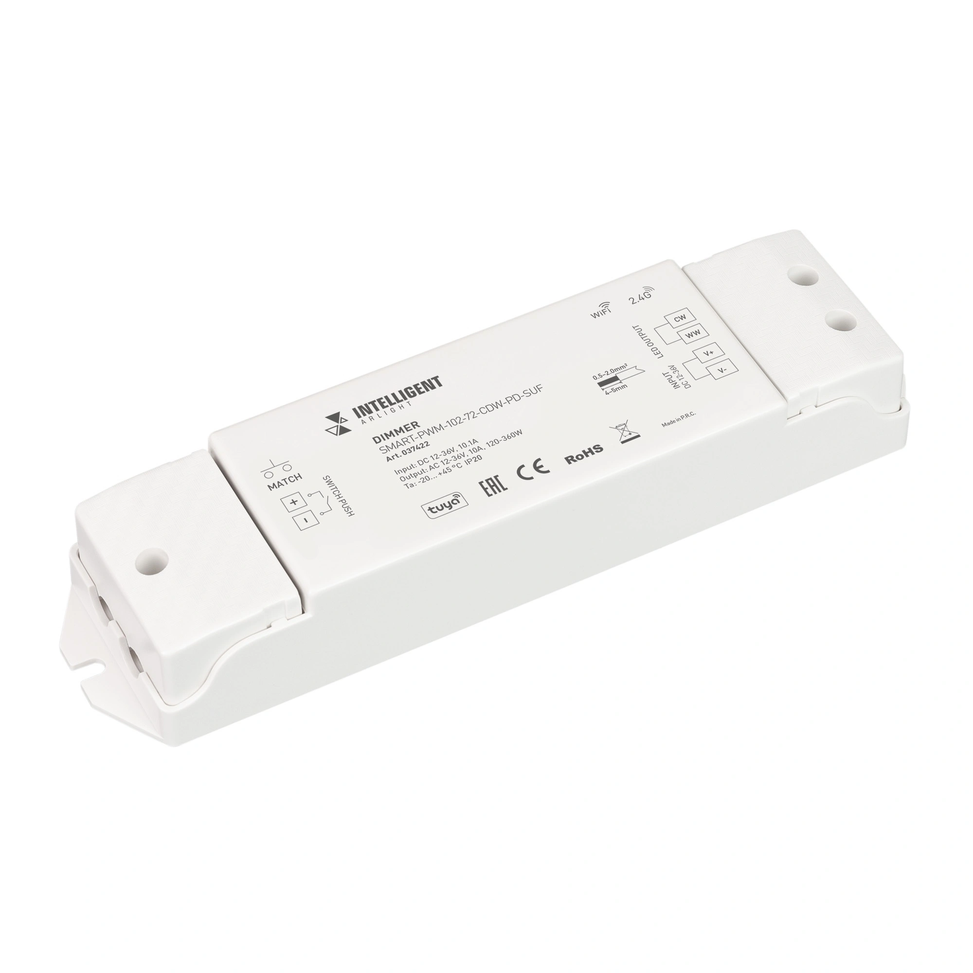 Диммер для управления биполярными светодиодными лентами (CDW) с напряжением питания 12-36В, поддерживающими диммирование ШИМ. Выполняет основные функции: включение/выключение, регулировка яркости и цветовой температуры. Устройство совместимо с радиочастотными пультами дистанционного управления и настенными панелями управления серии SMART. Возможна привязка до 10 пультов или панелей управления. Реализовано управление со смартфона (приложение Smart Life), поддерживается голосовое управление Яндекс Алиса. Питание от 12-36В, 2 канала управления, ток нагрузки 5А на канал, максимальная мощность 120-360 Вт. Габариты устройства 175x45x27 мм.