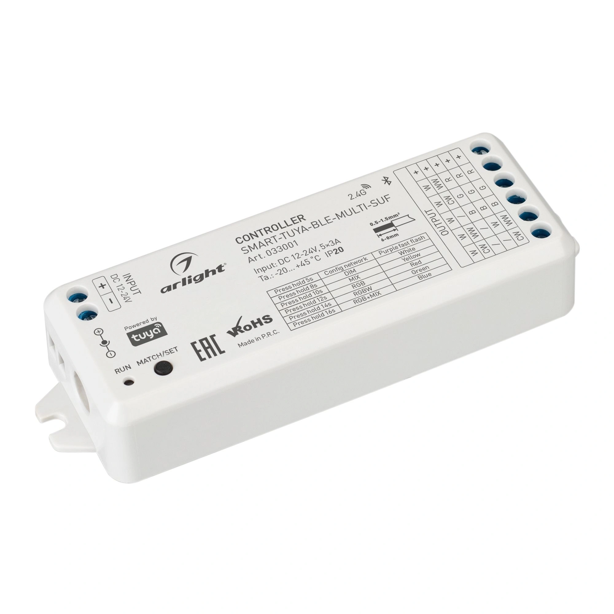 Диммер для управления мультицветной 5-канальной (RGB-MIX) светодиодной лентой по ШИМ и другими светодиодными источниками света с напряжением питания 12-24В. Выполняет основные фукнции: включение/выключение, регулировка яркости, изменение цветовой температуры, управление цветом. Управляется по Bluetooth и совместим беспроводной облачной платформой TUYA и АЛИСА от ЯНДЕКС при использовании конвертера Bluetooth-wifi. Управление со смартфона через приложение SMART LIFE. Устройство совместимо с радиочастотными пультами дистанционного управления и настенными панелями управления серии SMART. Возможна привязка до 10 пультов или панелей управления. Питание от 12-24В, 5 каналов управления, максимальная нагрузка 3А на канал, выходная мощность 180-360 Вт (в зависимости от напряжения питания). Габариты устройства 114x38x20 мм.