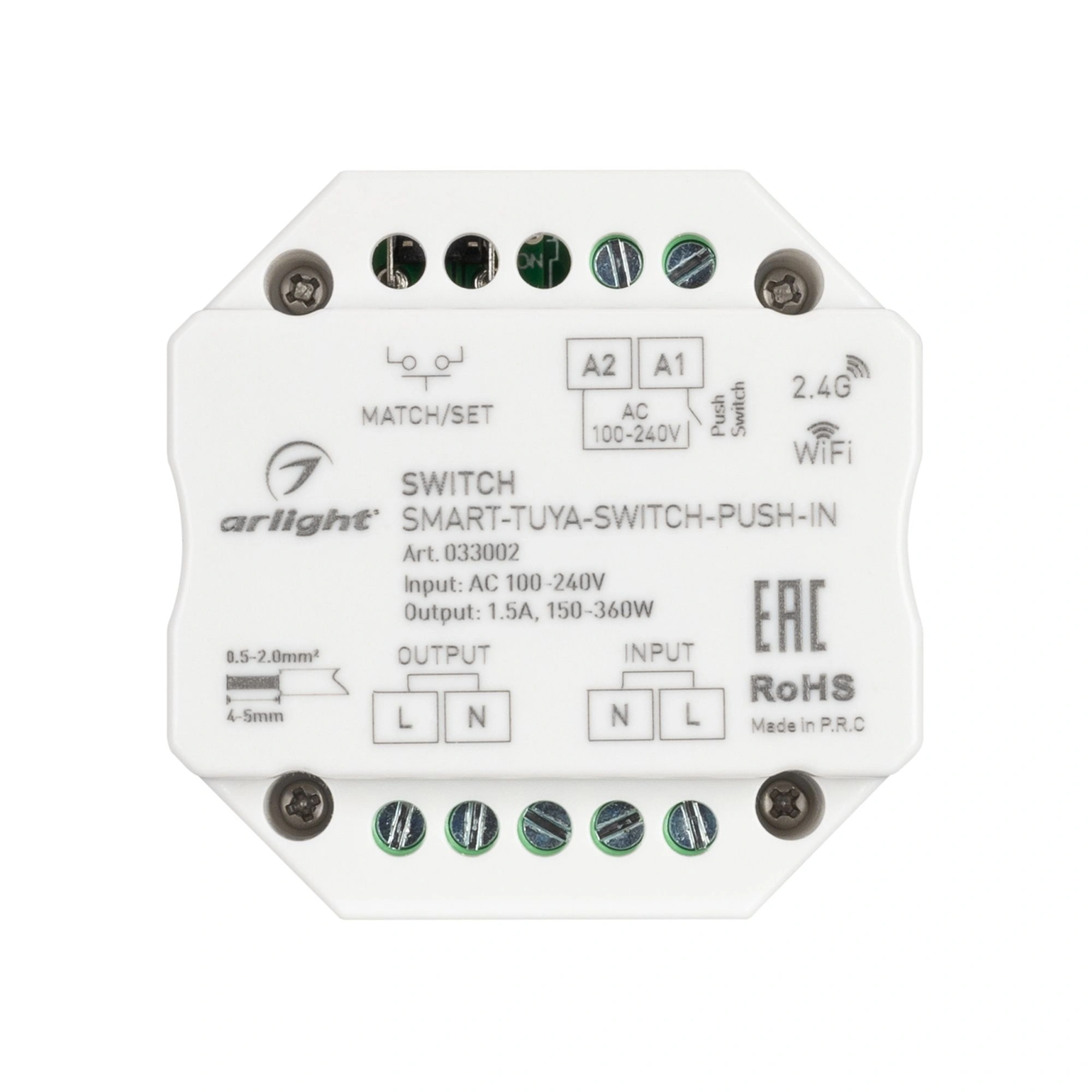 Выключатель для любых видов нагрузки AC 230V. Напряжение питания AC 100-240V, максимальный ток нагрузки 1.5А. Управление 2.4G+WiFi, интерфейс Tuya, поддерживается управление ЯНДЕКС АЛИСА, совместим с приложением INTELLIGENT ARLIGHT. Поддерживает функцию Push-Switch. Габариты 52x52x26 мм. Совместим с пультами и панелями SMART.