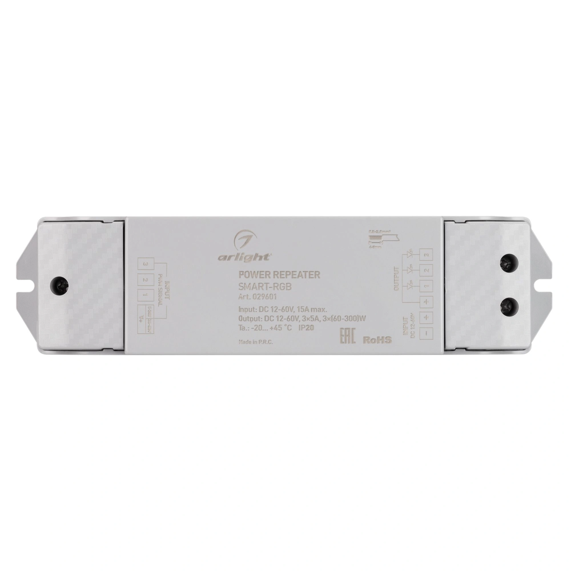 3-канальный усилитель, предназначенный для увеличения мощности и подключения большего количества мультицветных (RGB) светодиодных лент. Питание изделия имеет диапазон напряжений от 12В до 60В, максимальный ток 5А на 1 канал, максимальная мощность 216-1080Вт (в зависимости от напряжения питания). Усилитель имеет пластиковый корпус серого цвета. Габариты изделия составляют 175x45x27 мм.