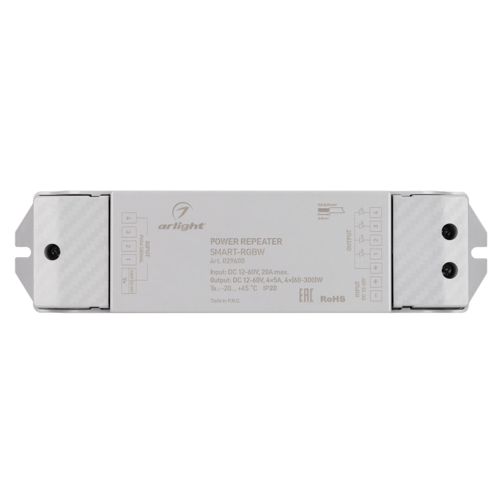 4-канальный усилитель, предназначенный для увеличения мощности и подключения большего количества мультицветных (RGBW) светодиодных лент. Питание изделия имеет диапазон напряжений от 12В до 60В, максимальный ток 5А на 1 канал, максимальная мощность 240-1200Вт (в зависимости от напряжения питания). Усилитель имеет пластиковый корпус серого цвета. Габариты изделия составляют 175x45x27 мм.