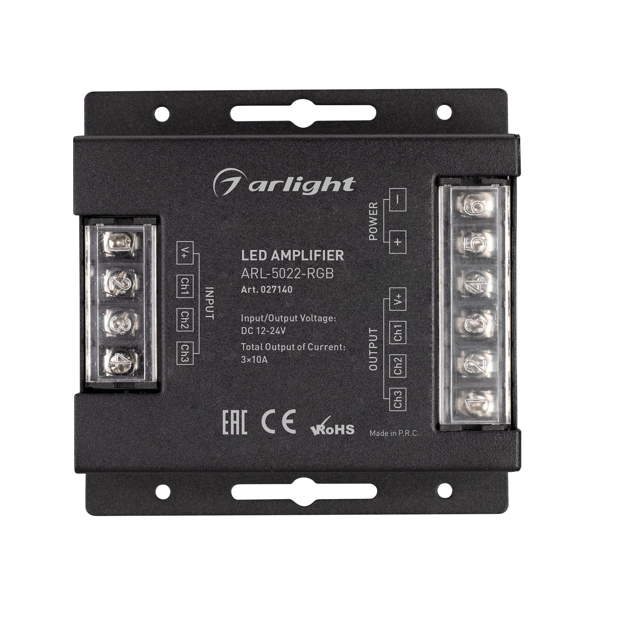 3-канальный силитель, предназначенный для увеличения мощности и подключения большего количества мультицветных RGB светодиодных лент. Питание изделия имеет диапазон напряжений от 12В до 24В, максимальный ток 10А на 1 канал, максимальная мощность 360-720Вт (в зависимости от напряжения питания). Усилитель имеет металлический корпус черного цвета. Это позволяет лучше отводить тепло и увеличивает срок службы изделия. Габариты усилителя составляют 91x88x24мм.