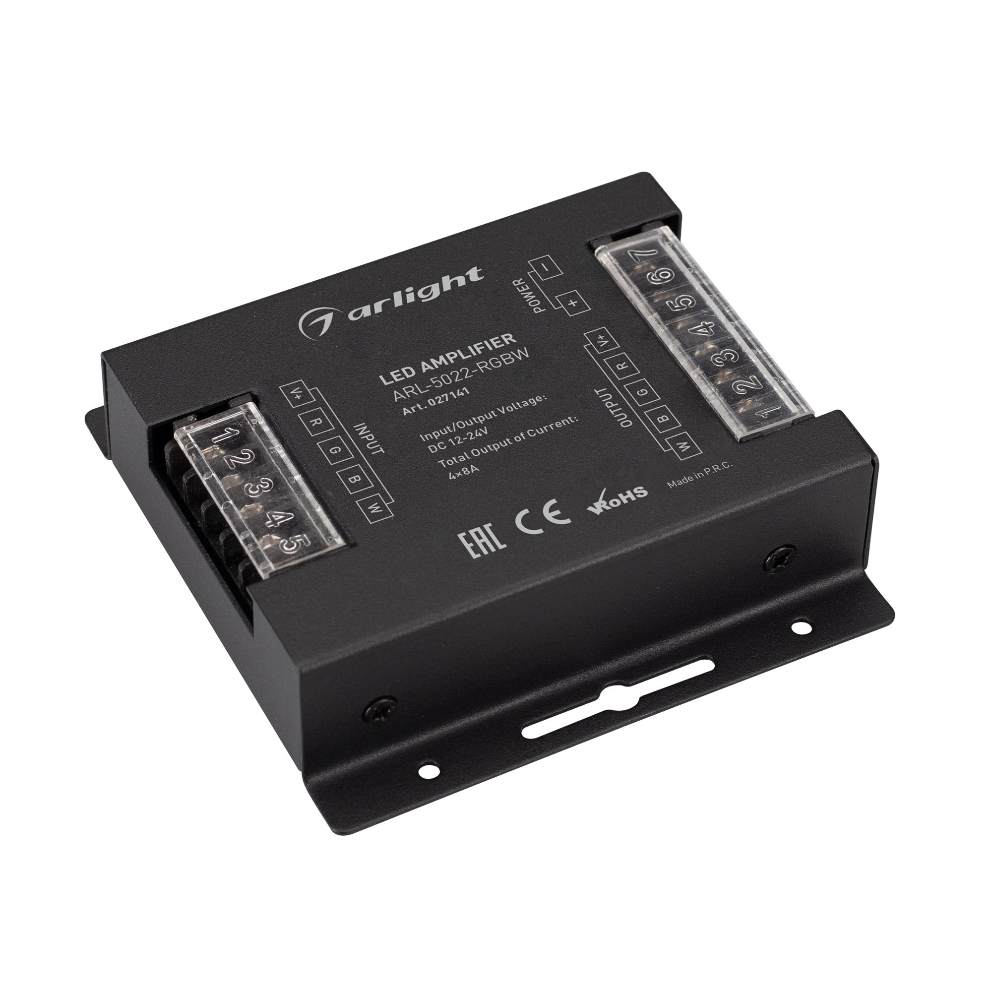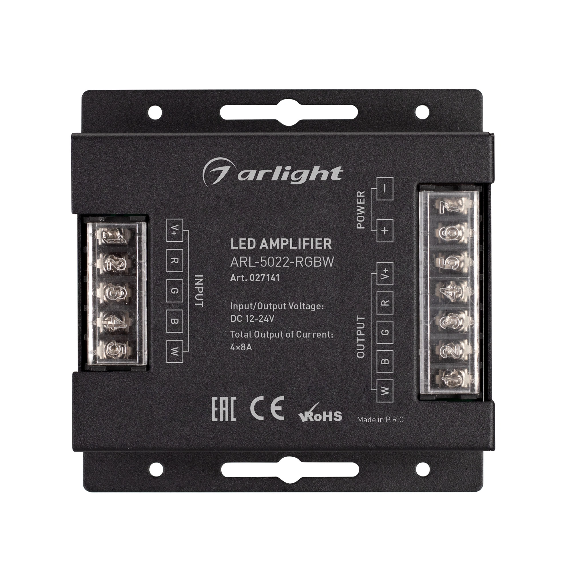 4-канальный силитель, предназначенный для увеличения мощности и подключения большего количества мультицветных RGBW светодиодных лент. Питание изделия имеет диапазон напряжений от 12В до 24В, максимальный ток 8А на 1 канал, максимальная мощность 384-768Вт (в зависимости от напряжения питания). Усилитель имеет металлический корпус черного цвета. Это позволяет лучше отводить тепло и увеличивает срок службы изделия. Габариты усилителя составляют 94x92x26мм.