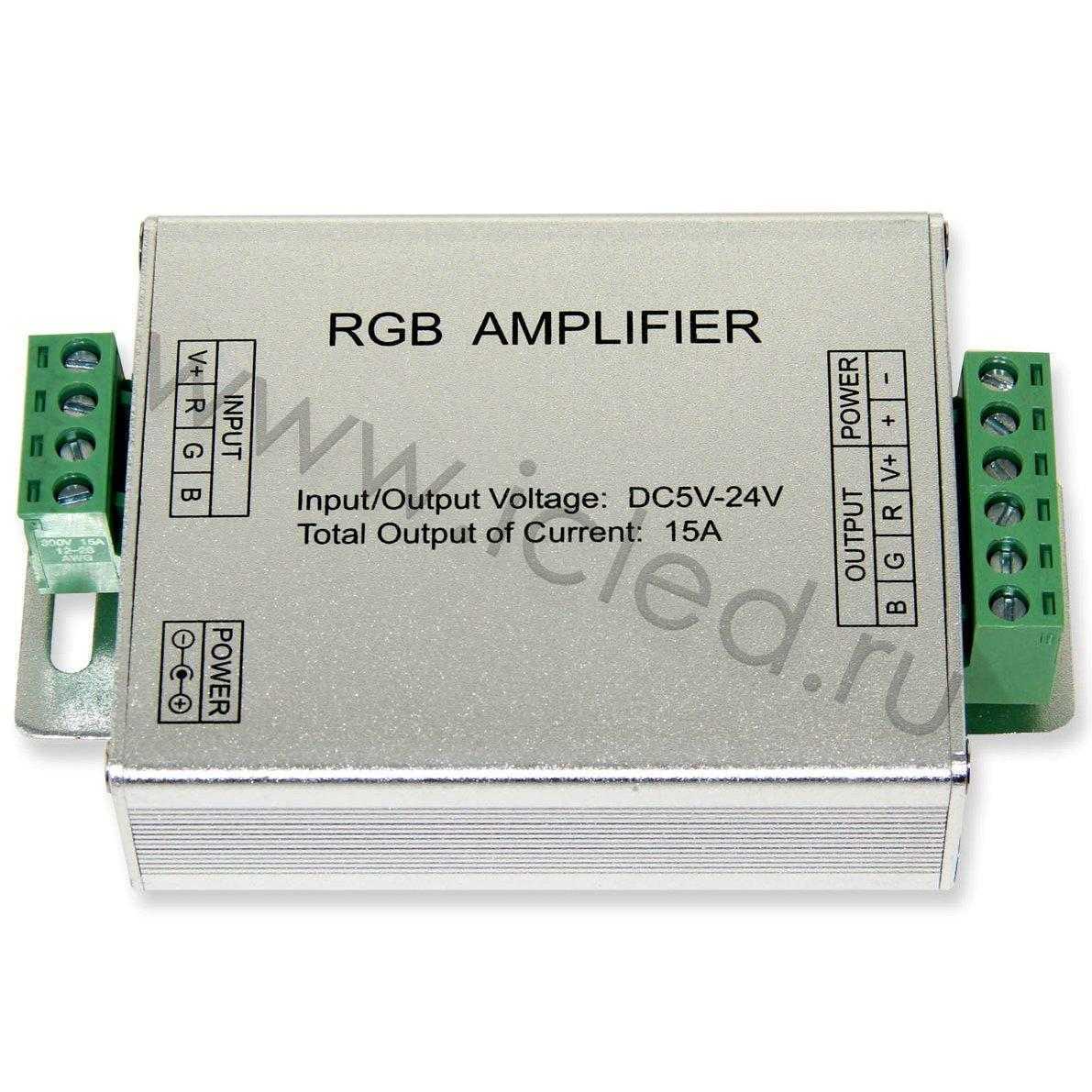 Усилитель RGB для светодиодных лент. Напряжение питания 12-24V, 3 канала, выходной ток до 15A (до 5A на канал), мощность 180-360W, размеры 102х67х25мм.